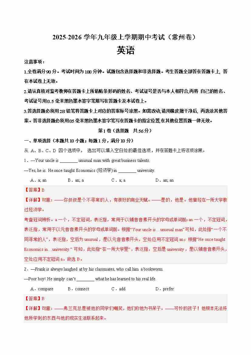 九年级英语上学期期中考试(常州卷)(教师版)