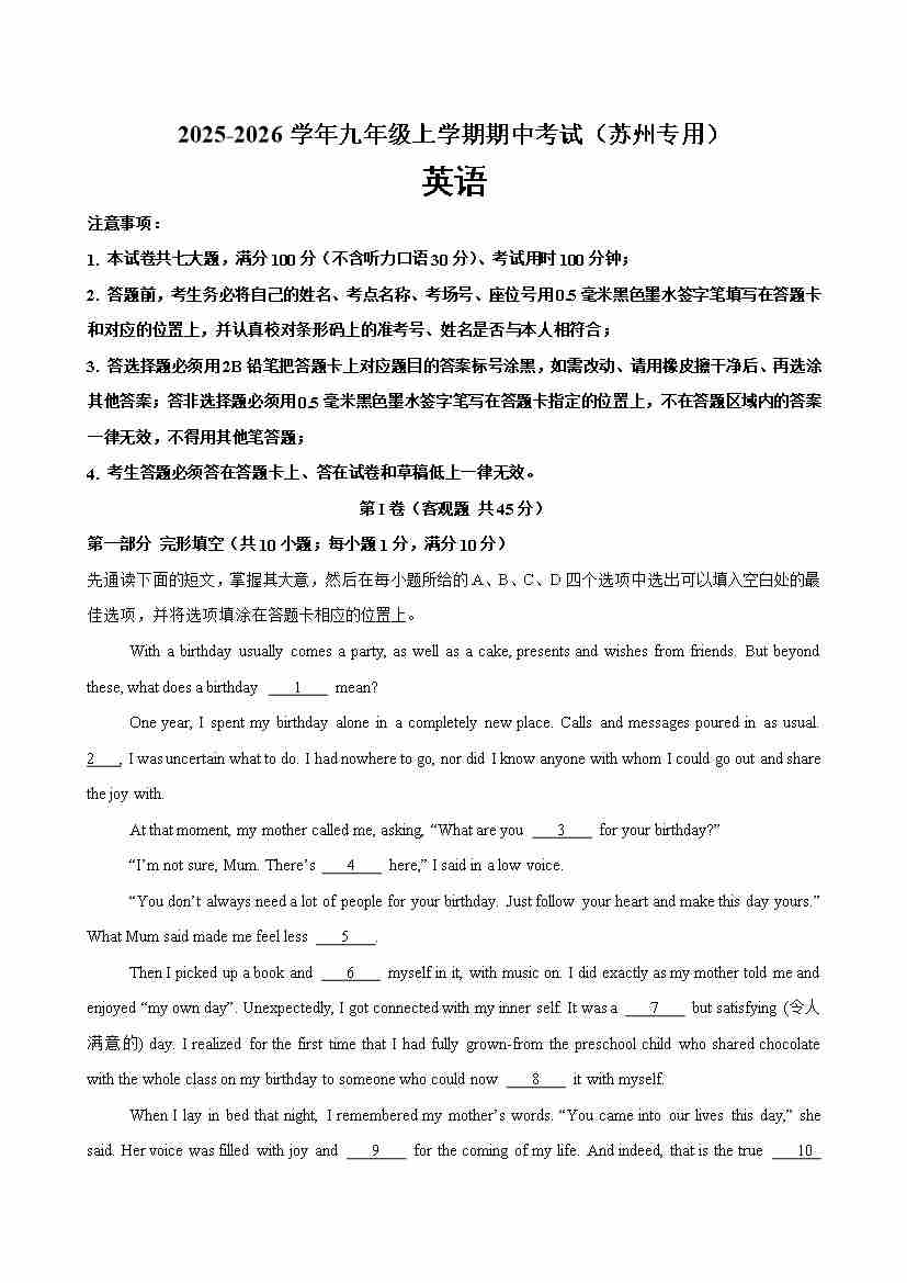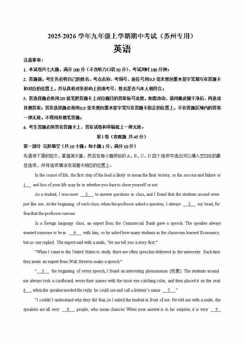 九年级英语上学期期中考试(苏州卷)(学生版)