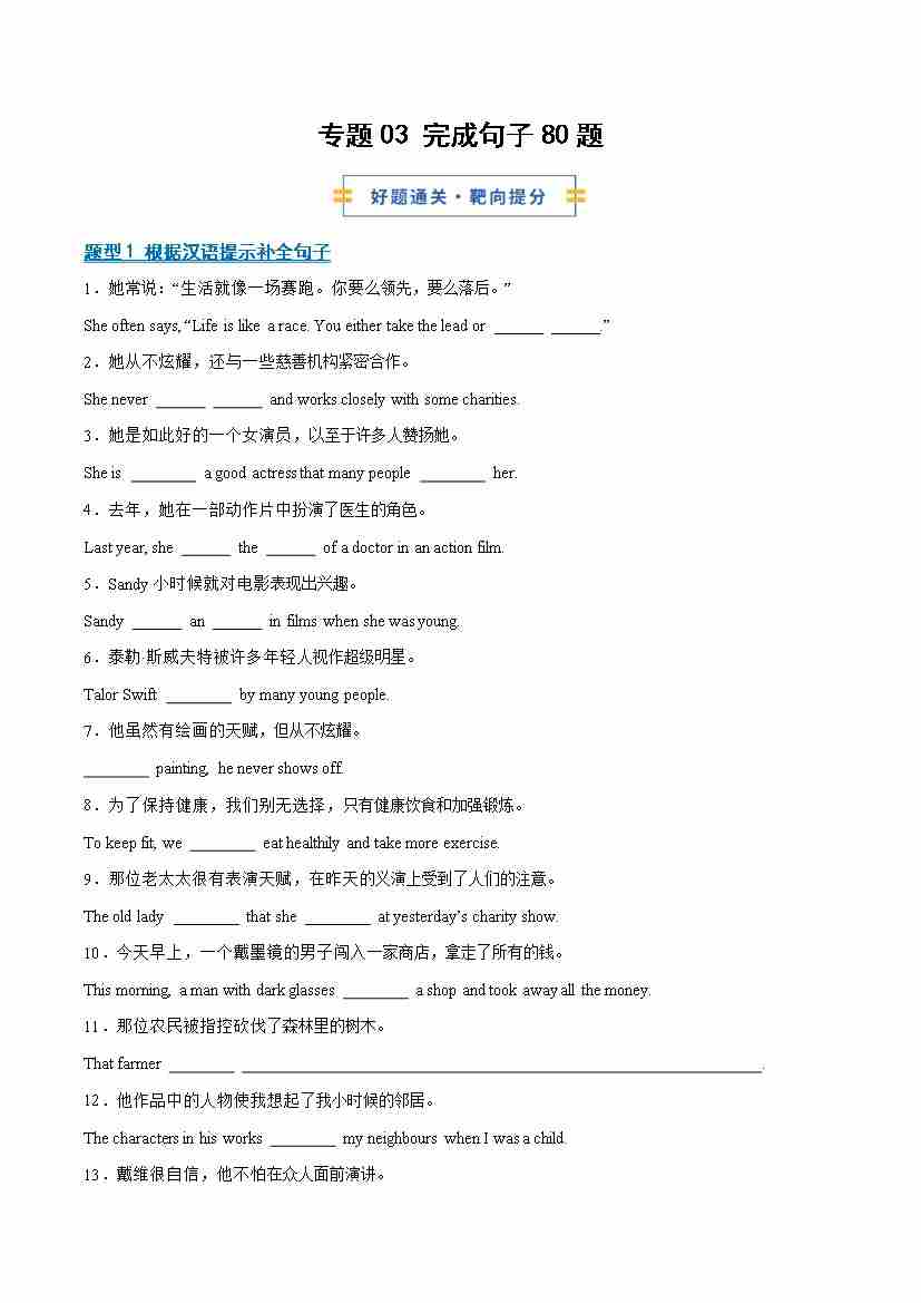 考前押题03 完成句子80题(期末复习专项训练)(教师版)