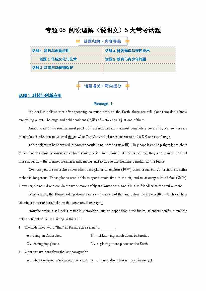考前押题06 阅读理解(说明文)5大常考话题(期末专项训练)(教师版)