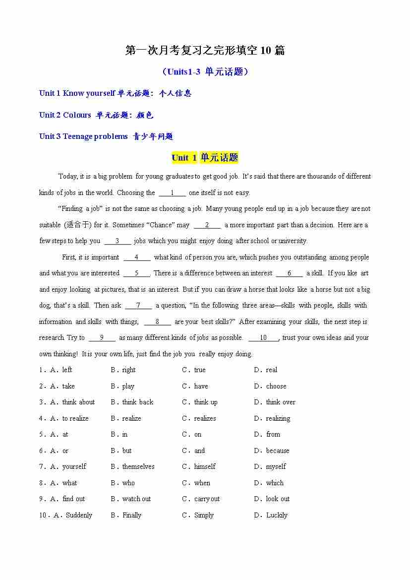 第一次月考复习之完形填空10篇(Units1-3单元话题)(教师版)