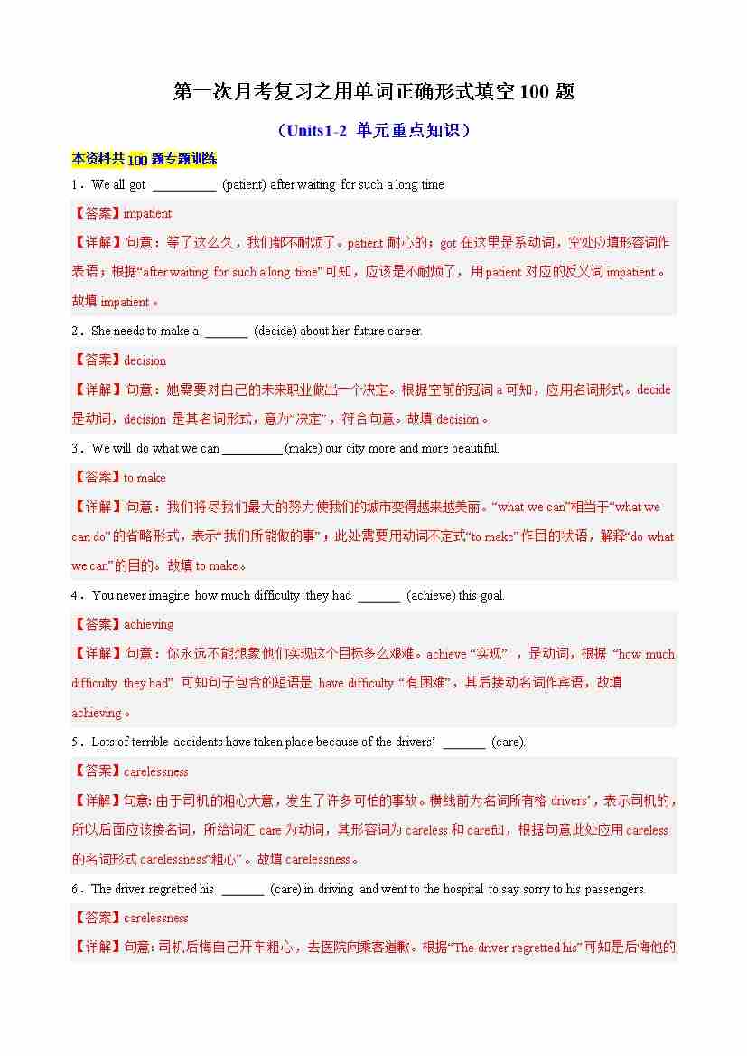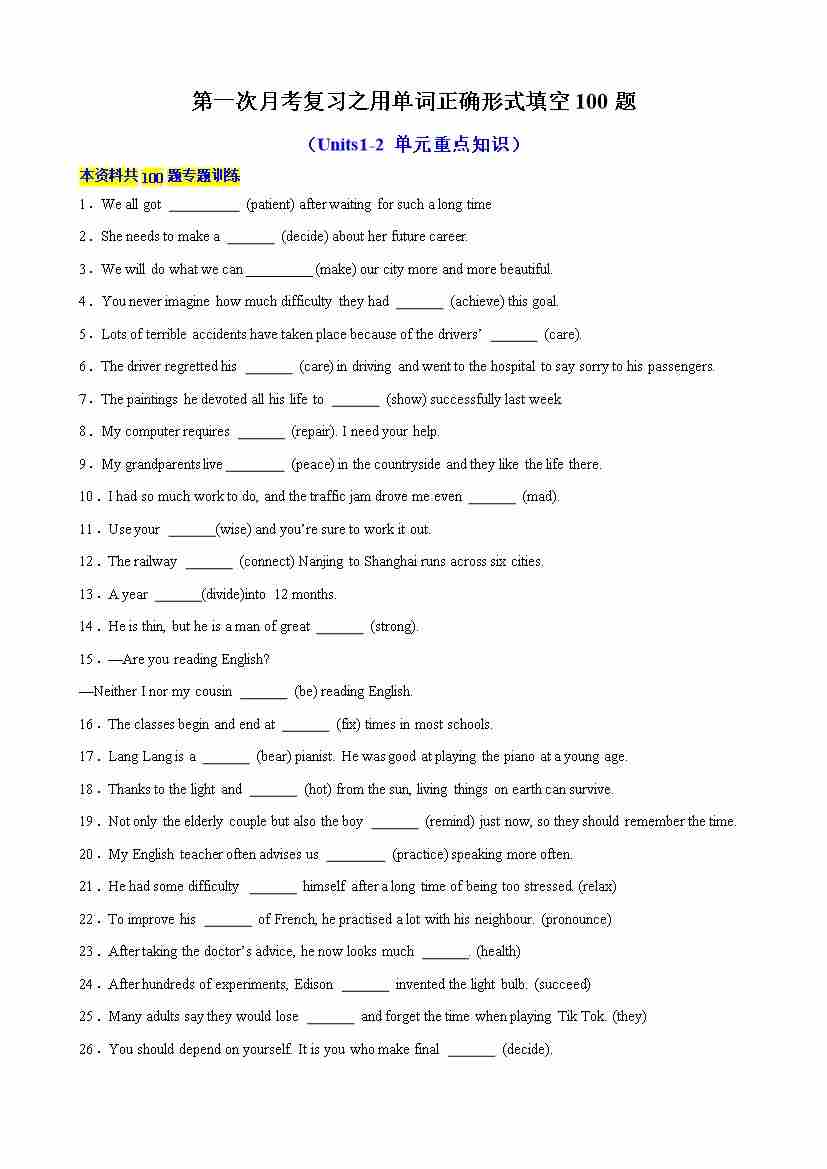 第一次月考复习之用单词正确形式填空100题(Units 12)(教师版)