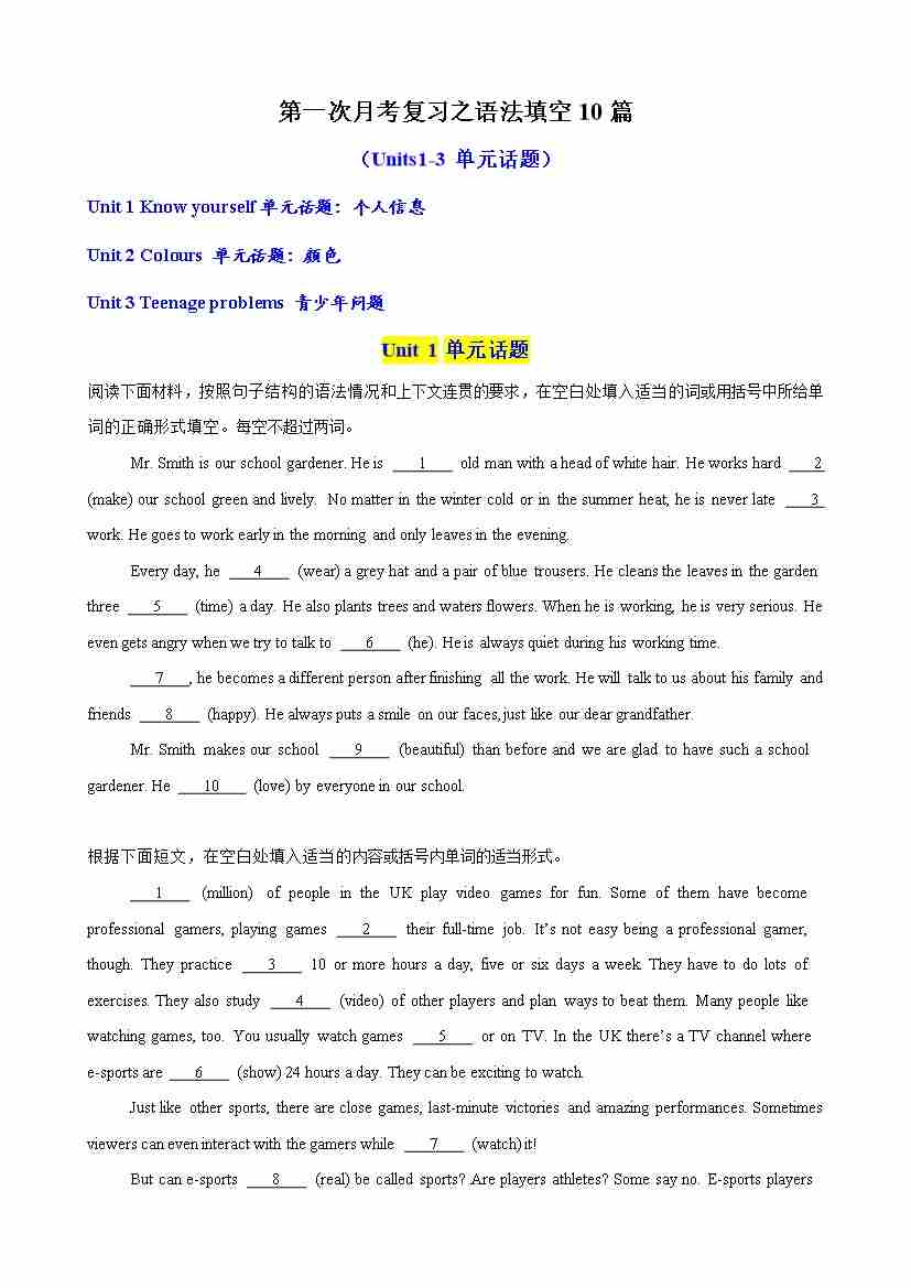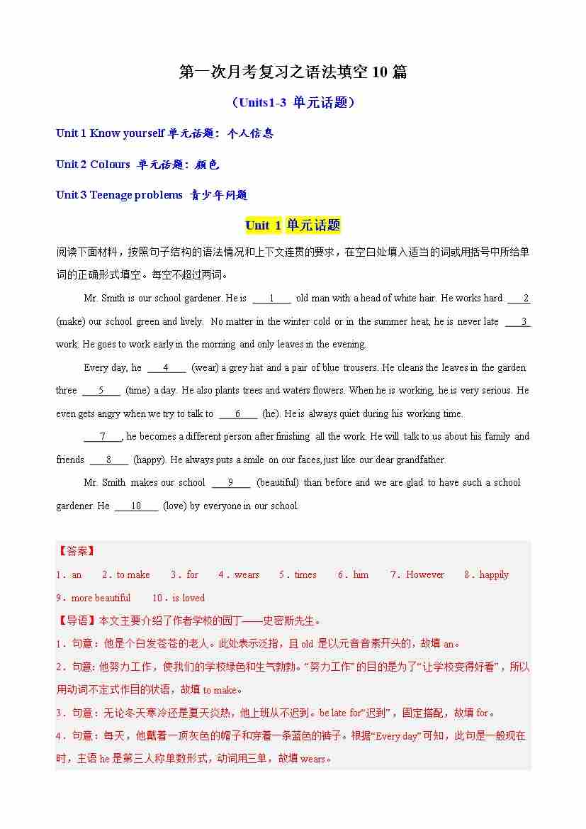 第一次月考复习之语法填空10篇(Units1-3单元话题)(教师版)