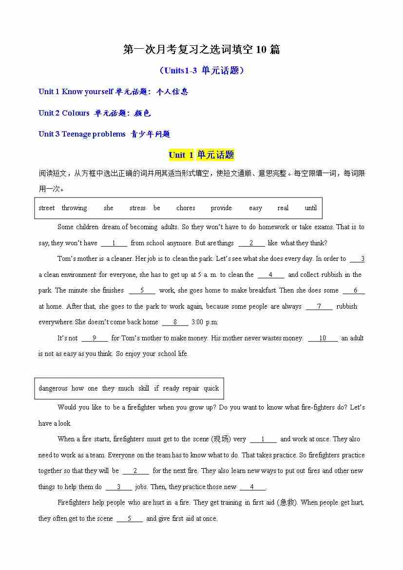 第一次月考复习之选词填空10篇(Units1-3单元话题)(学生版)