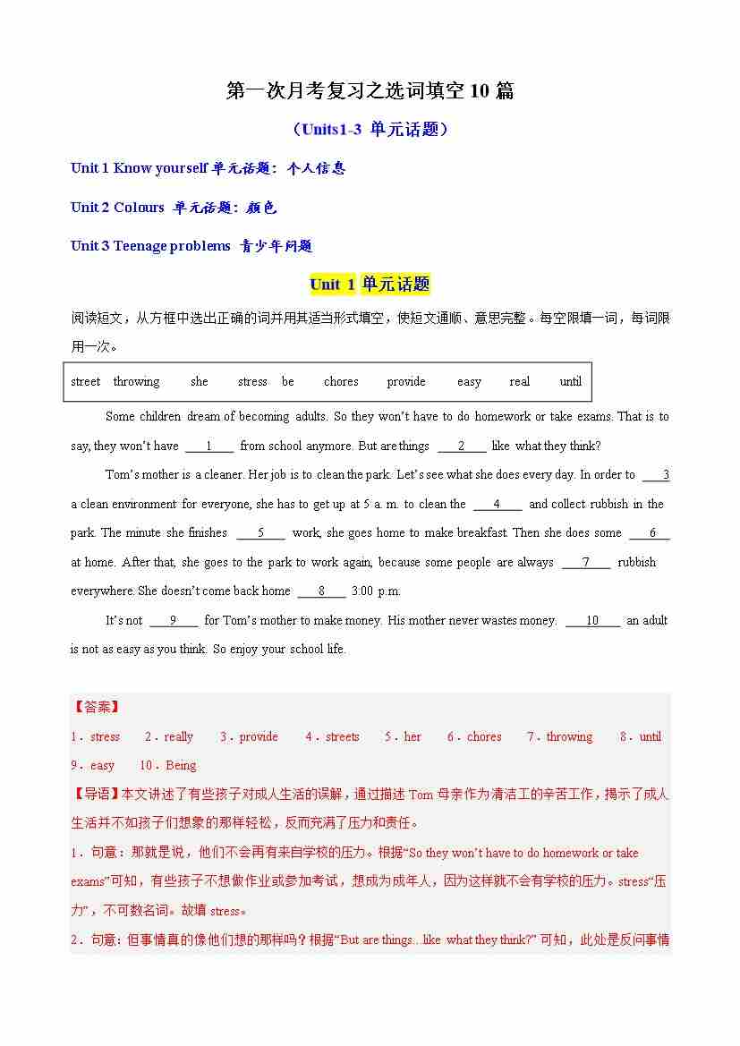 第一次月考复习之选词填空10篇(Units1-3单元话题)(教师版)