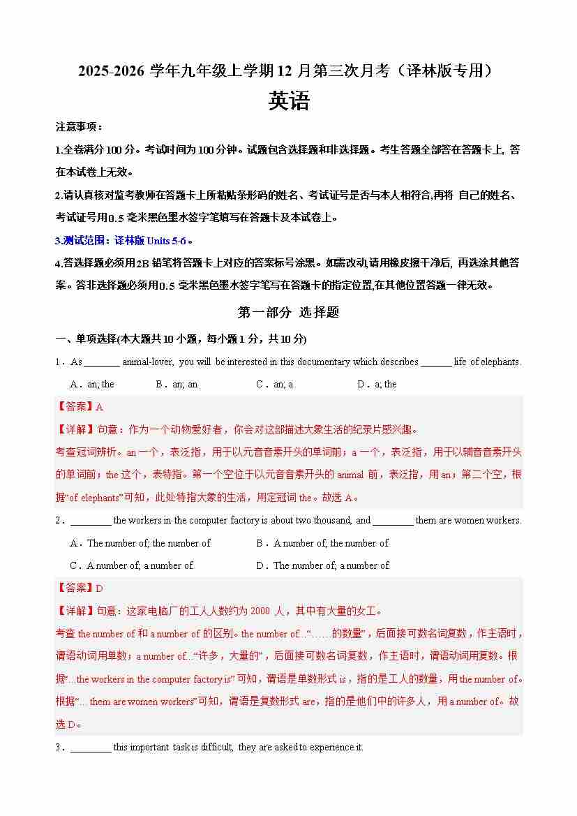 九年级英语上学期12月第三次月考(译林版专用)(测试范围:Units 5-6)(教师版)