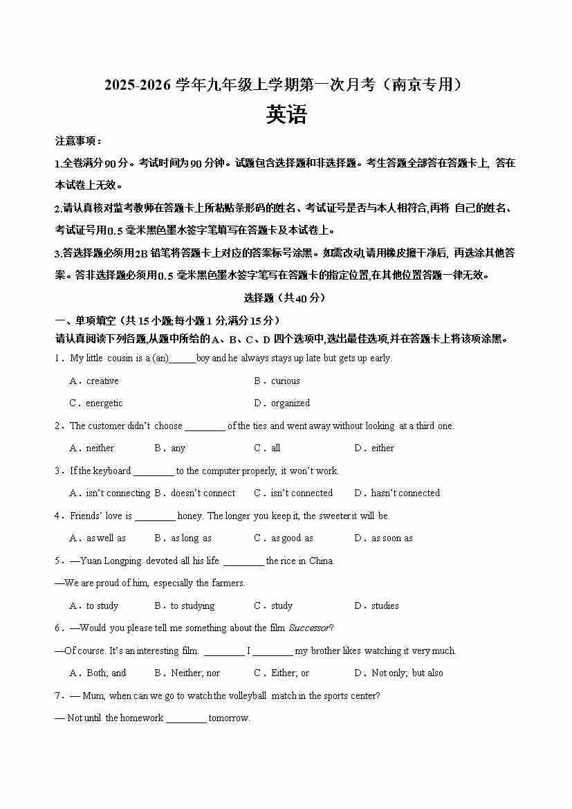 九年级英语上学期第一次月考(南京专用)(学生版)