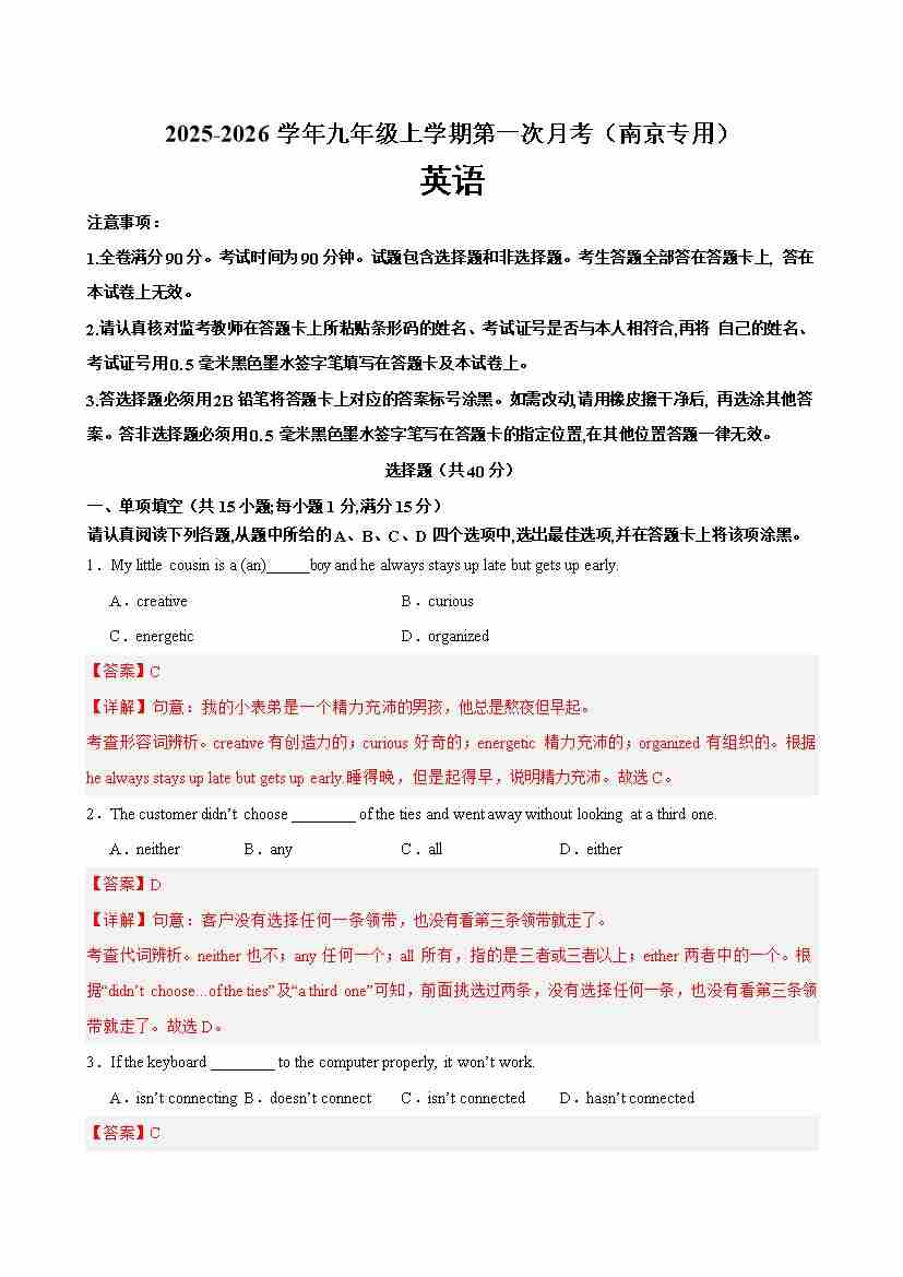 九年级英语上学期第一次月考(南京专用)(教师版)