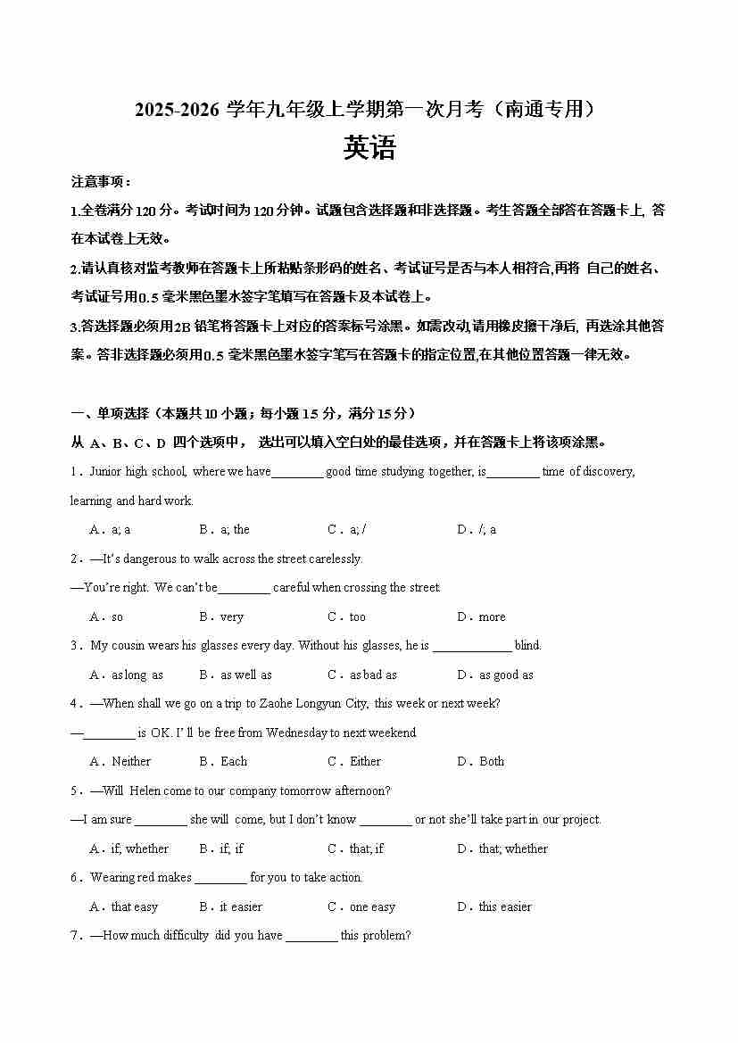 九年级英语上学期第一次月考(南通专用)(学生版)