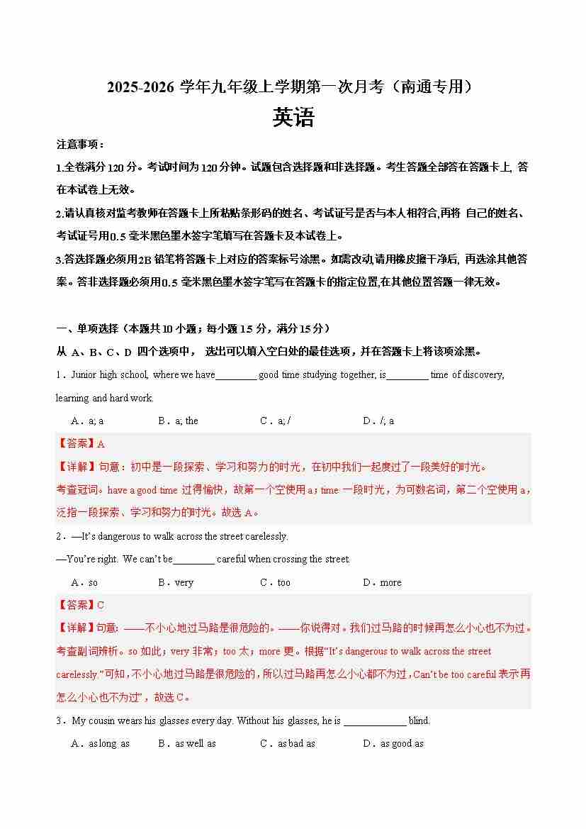 九年级英语上学期第一次月考(南通专用)(教师版)