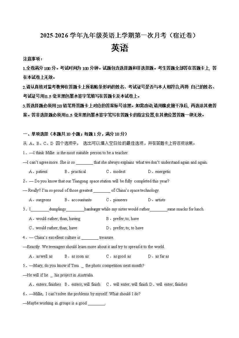 九年级英语上学期第一次月考(宿迁卷)(学生版)