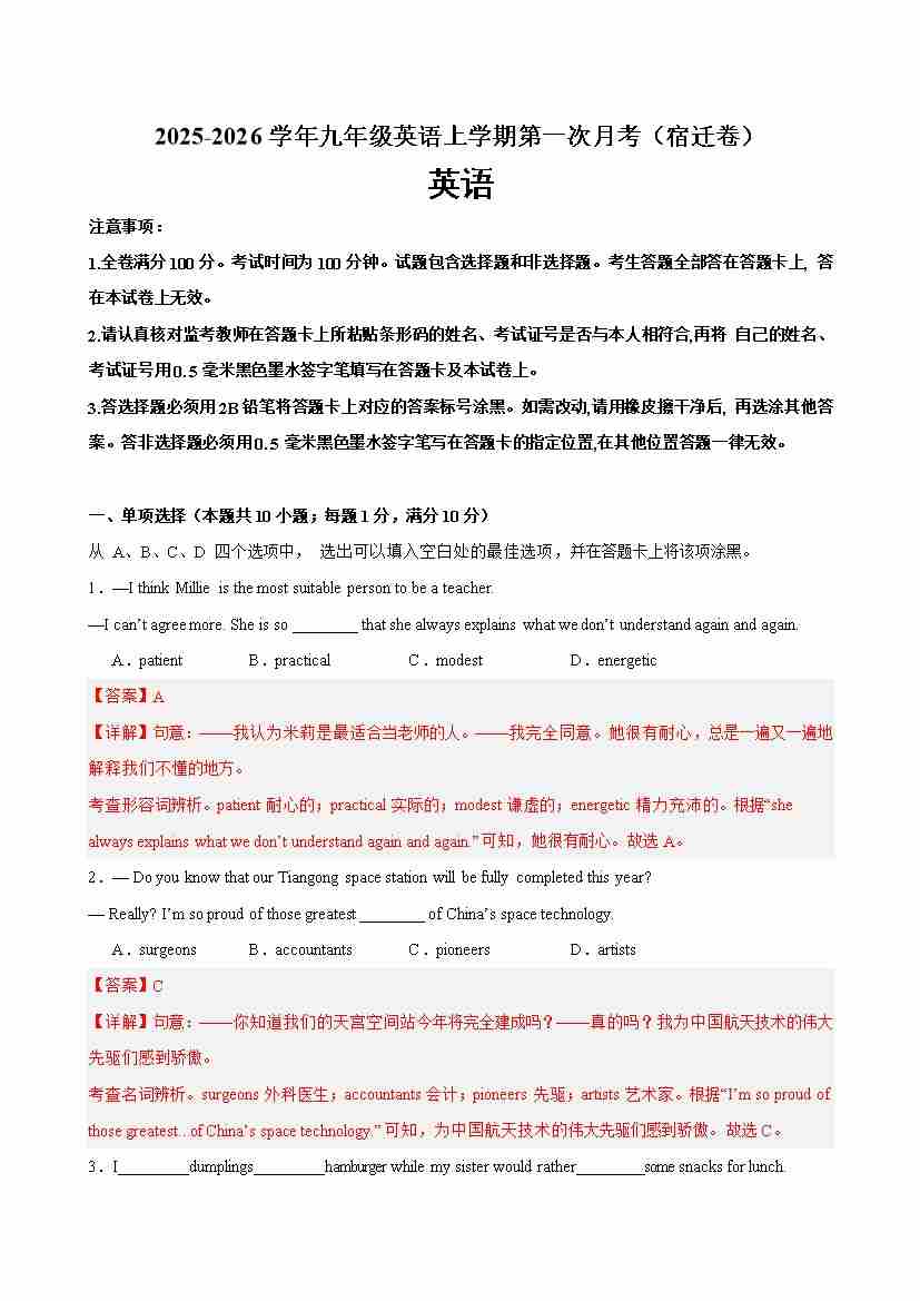 九年级英语上学期第一次月考(宿迁卷)(教师版)