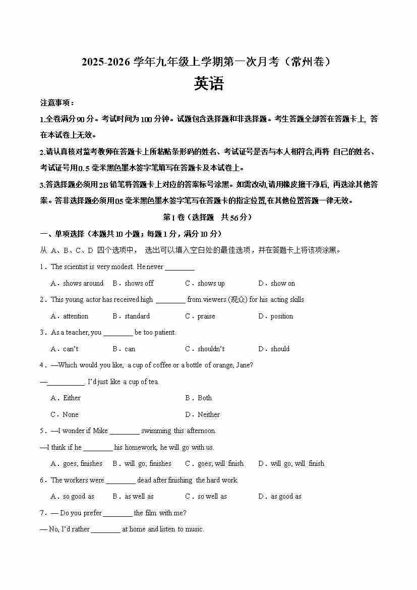 九年级英语上学期第一次月考(常州专用)(学生版)