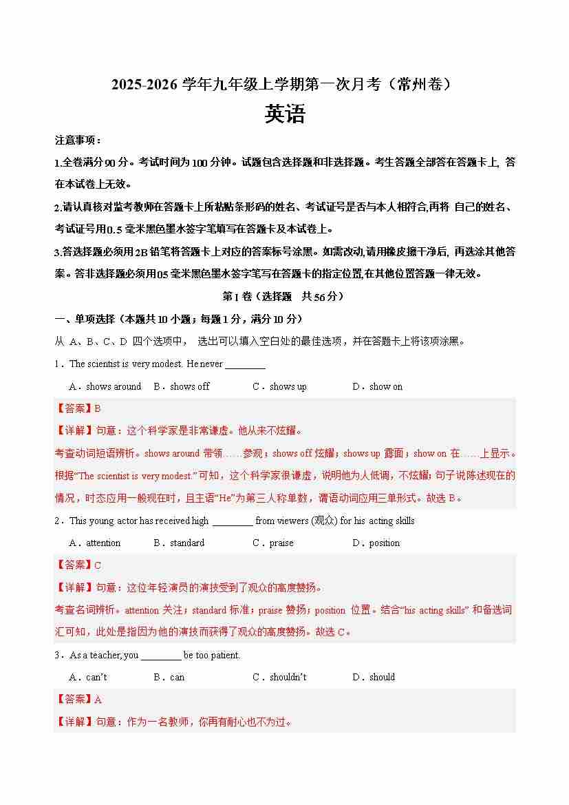 九年级英语上学期第一次月考(常州专用)(教师版)