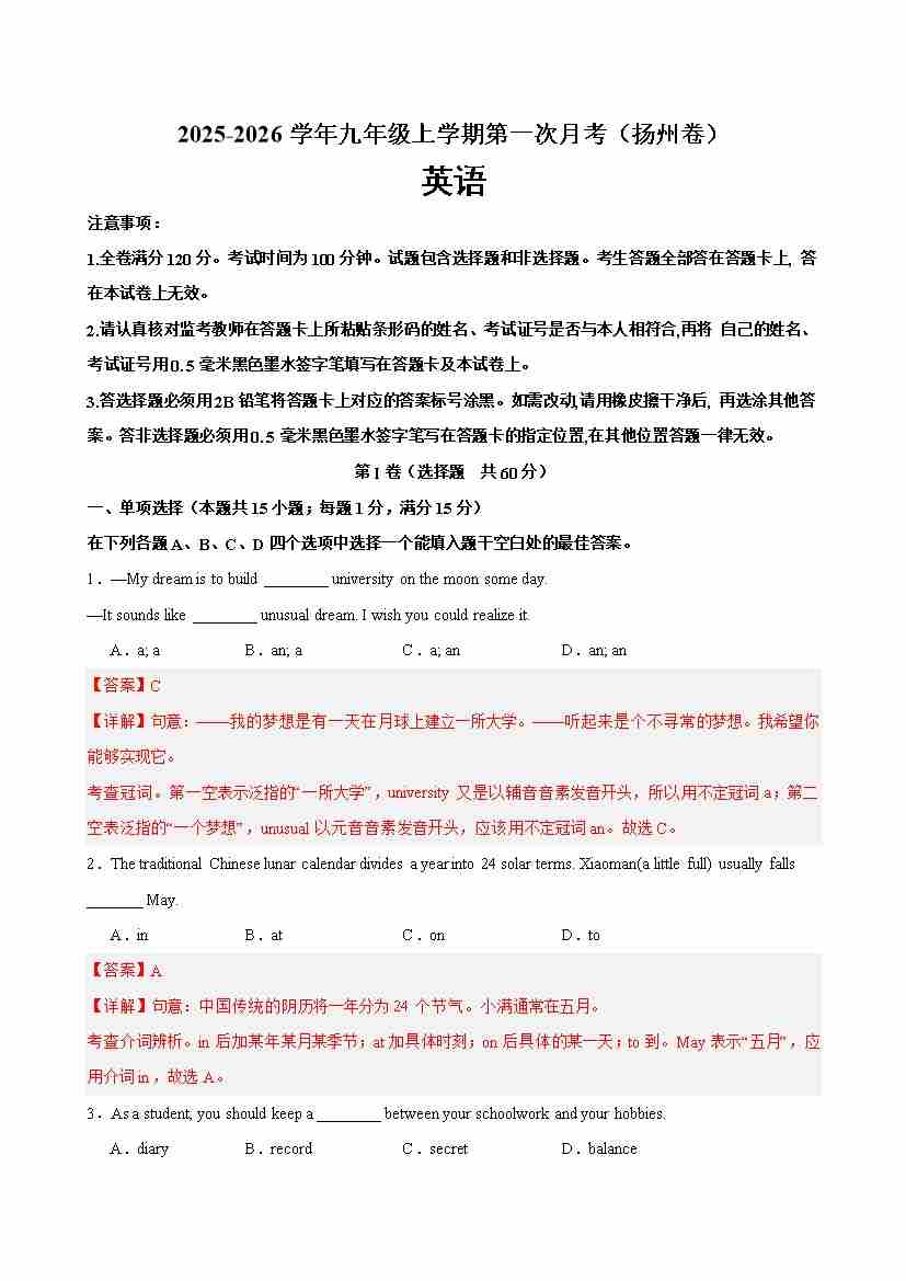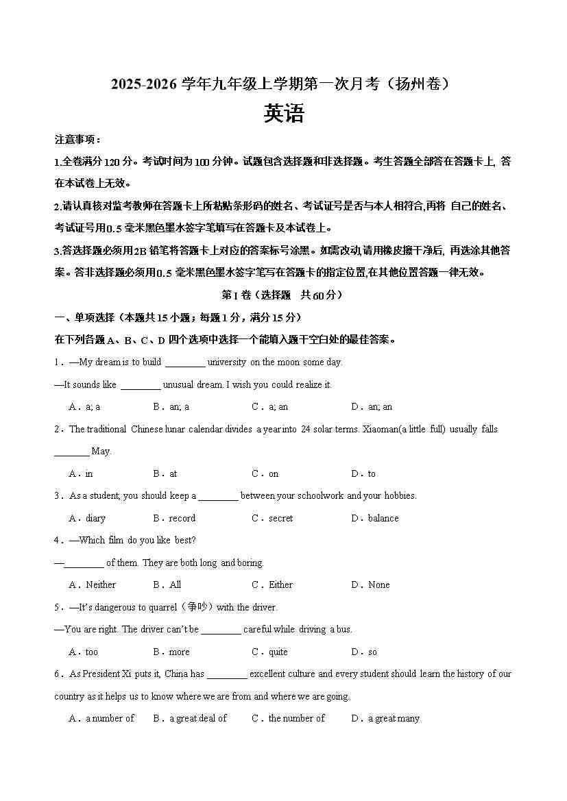 九年级英语上学期第一次月考(扬州专用)(学生版)