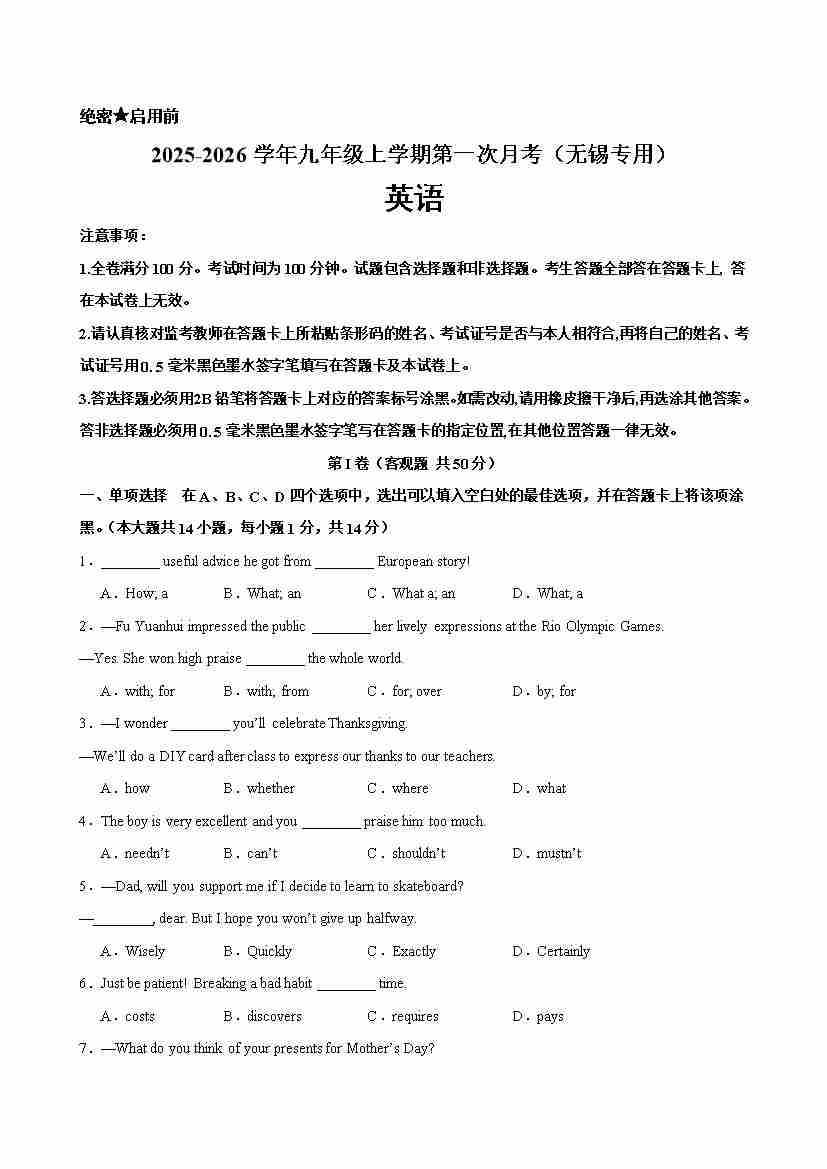 九年级英语上学期第一次月考(无锡专用)(学生版)