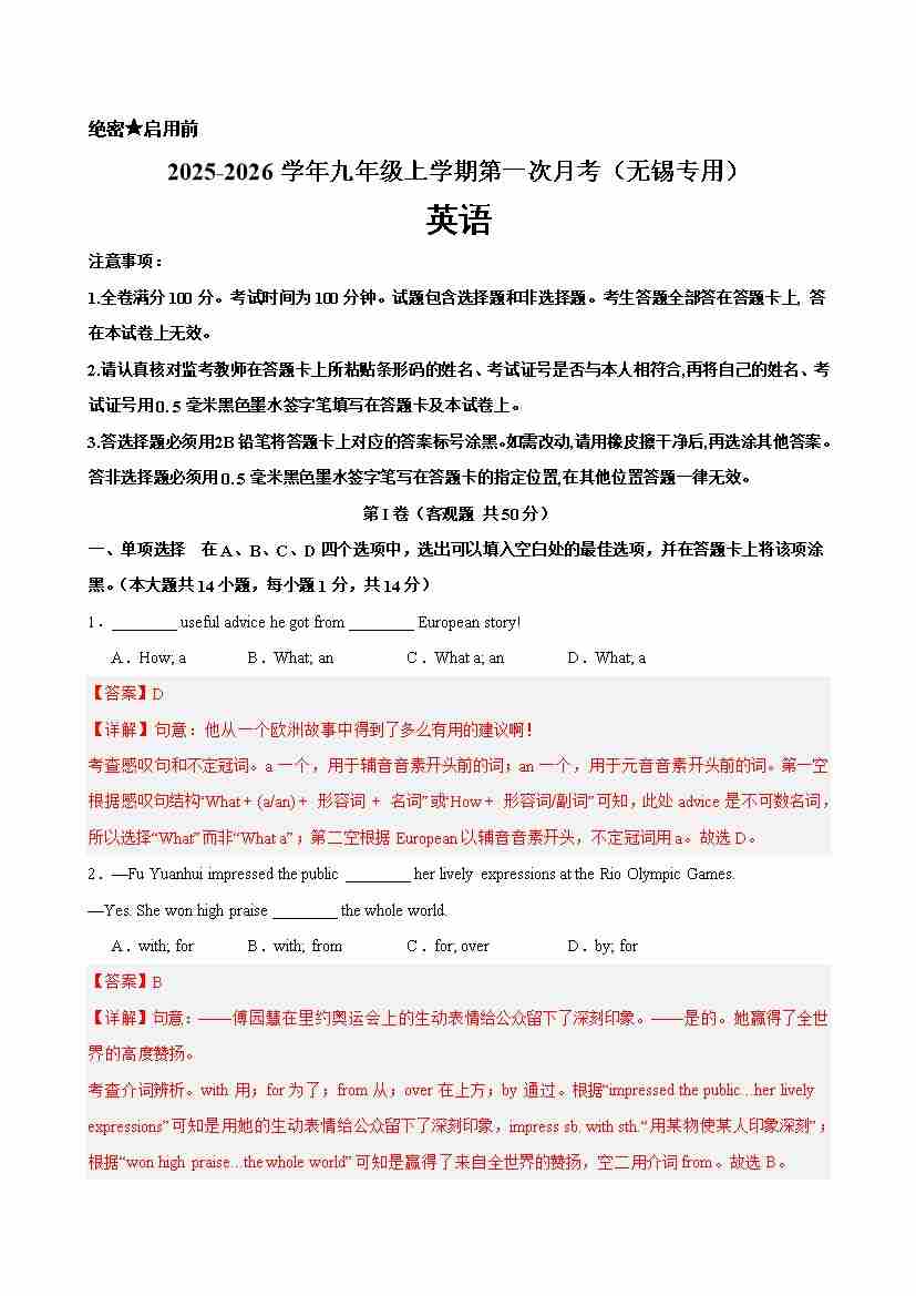 九年级英语上学期第一次月考(无锡专用)(教师版)