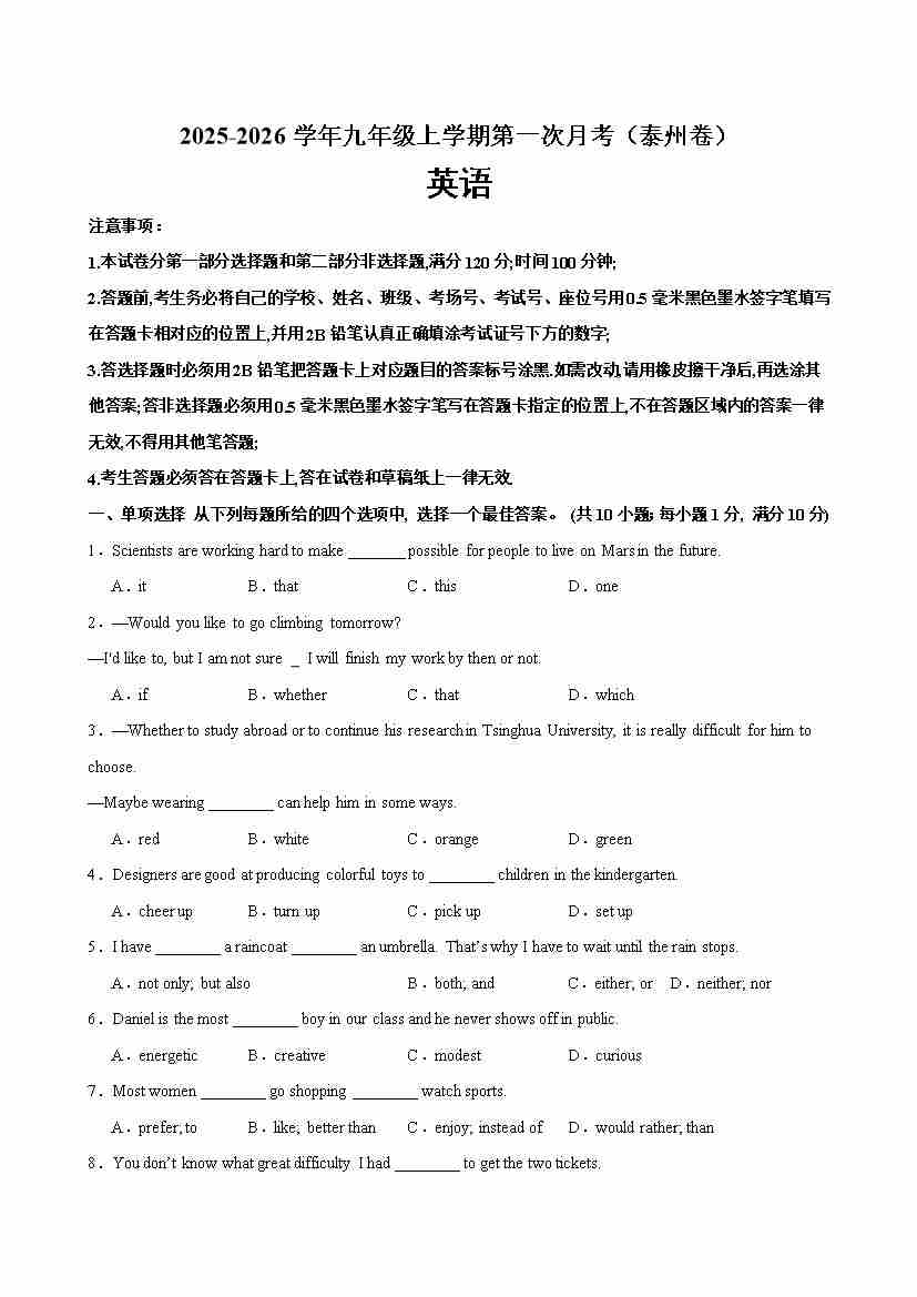 九年级英语上学期第一次月考(泰州专用)(学生版)