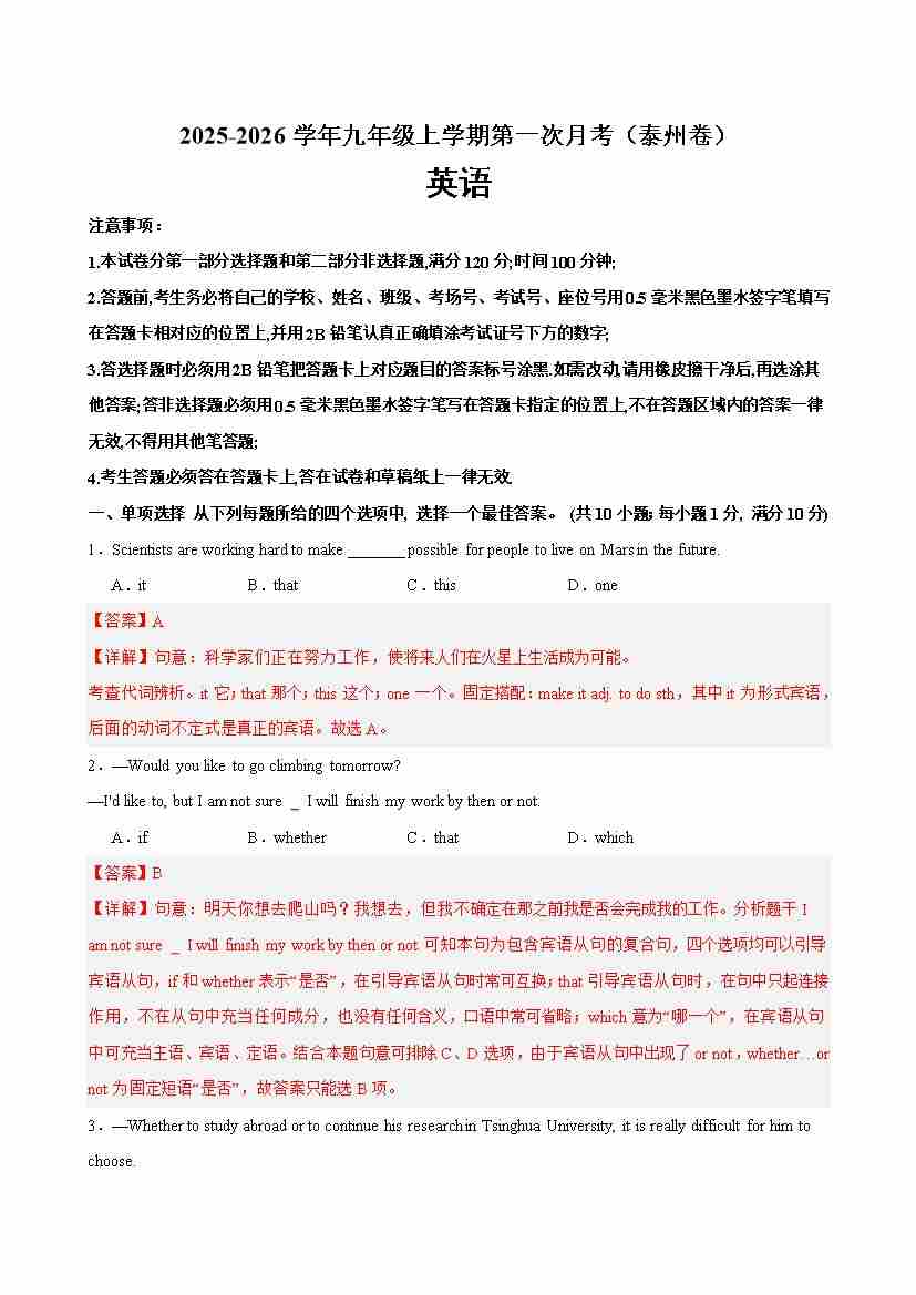 九年级英语上学期第一次月考(泰州专用)(教师版)