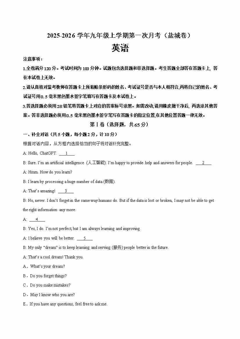 九年级英语上学期第一次月考(盐城专用)(学生版)