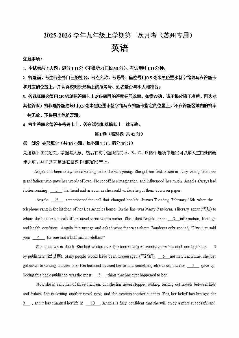 九年级英语上学期第一次月考(苏州专用)(学生版)
