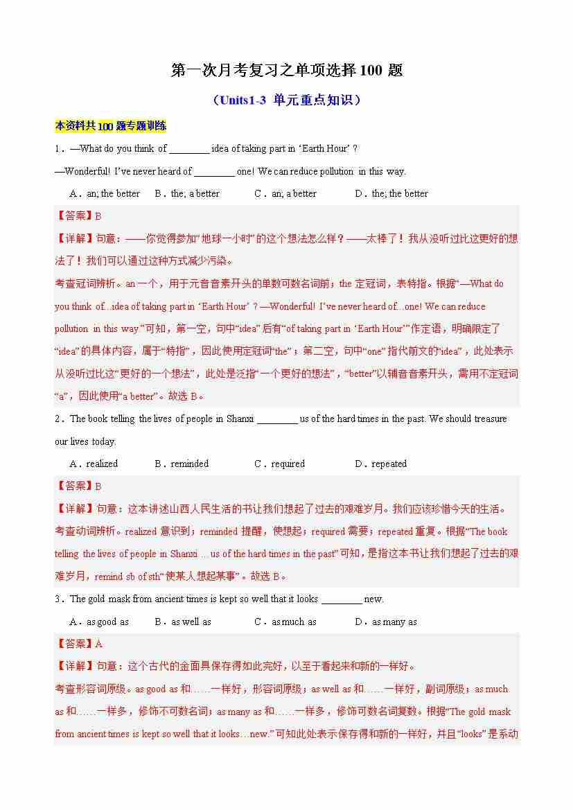 第一次月考复习之单项选择100题(Units13单元重点知识)(教师版)