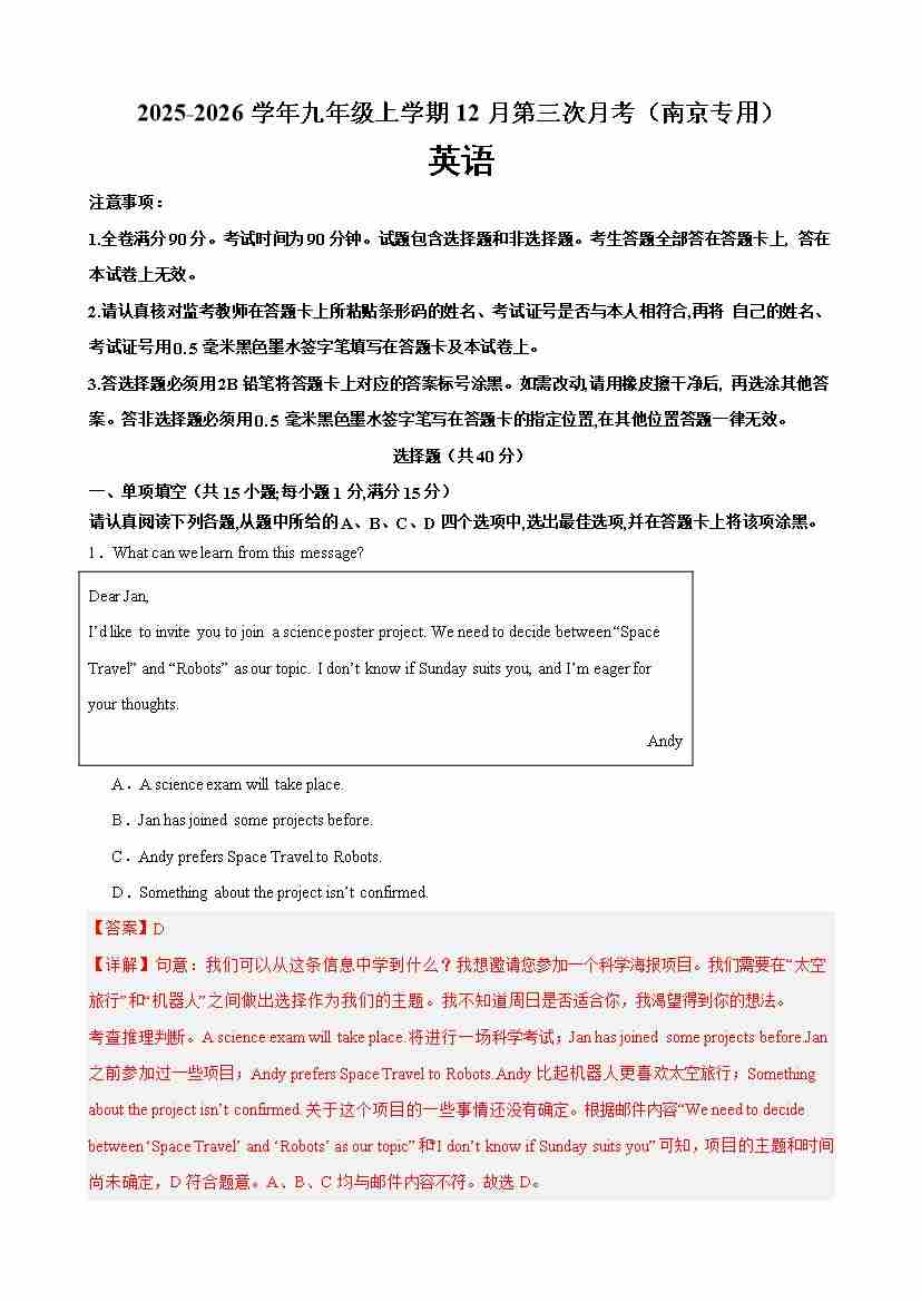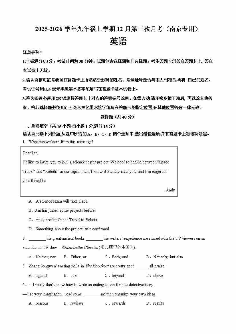九年级英语上学期12月第三次月考(南京专用)(学生版)
