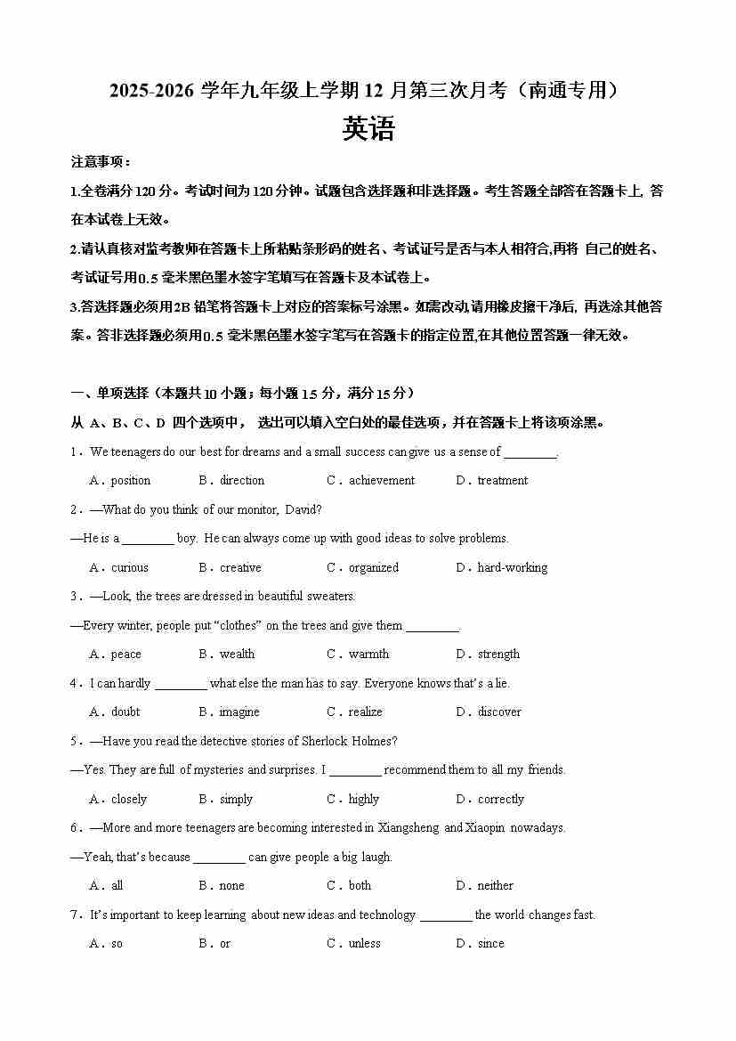 九年级英语上学期12月第三次月考(南通专用)(学生版)