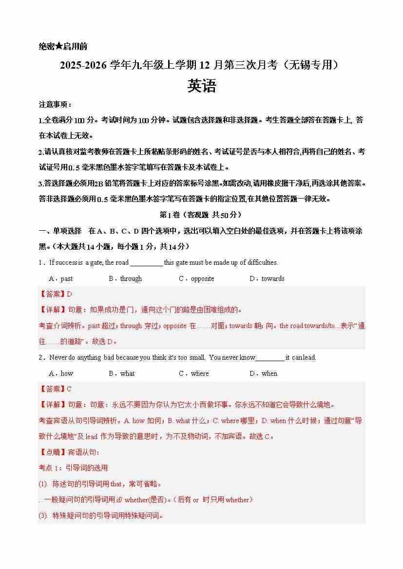 九年级英语上学期12月第三次月考(无锡专用)(教师版)