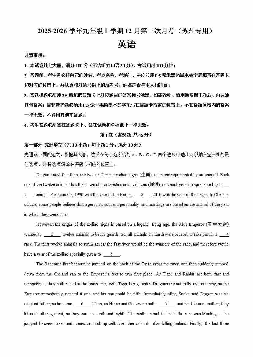 九年级英语上学期12月第三次月考(苏州专用)(学生版)