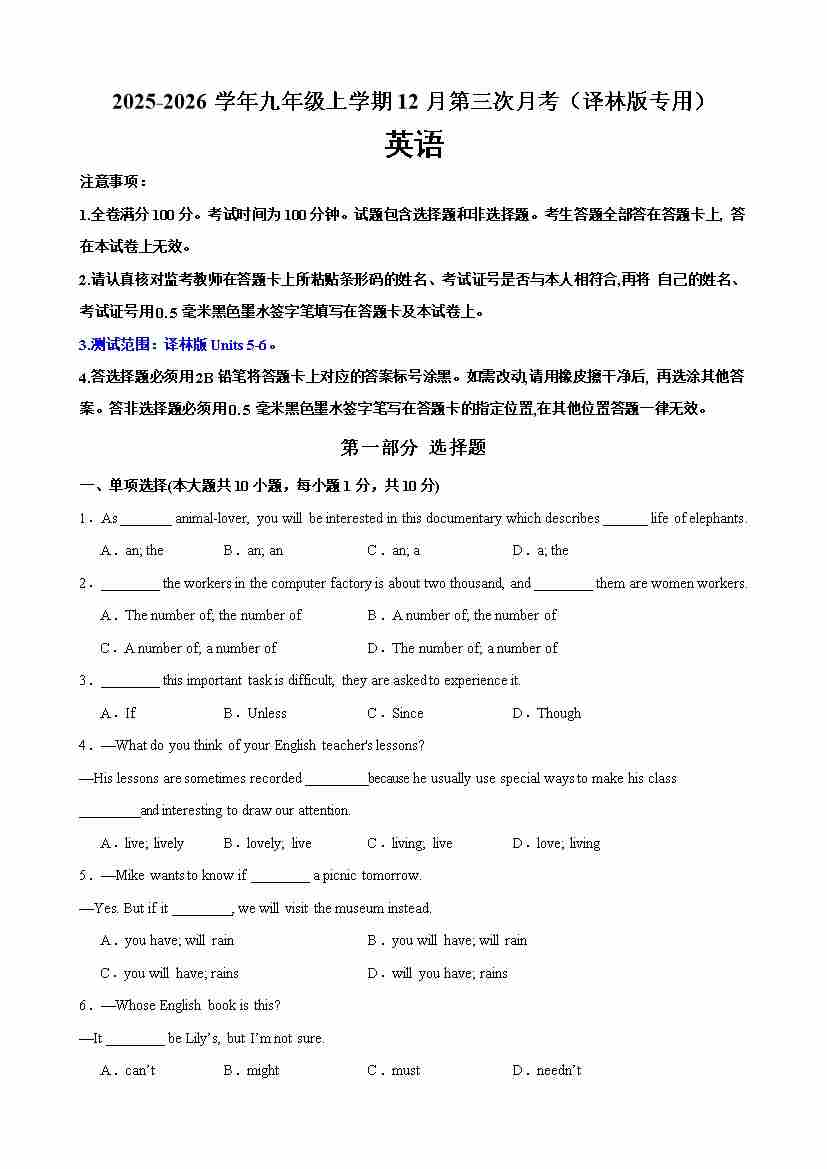 九年级英语上学期12月第三次月考(译林版专用)(测试范围:Units 5-6)(学生版)