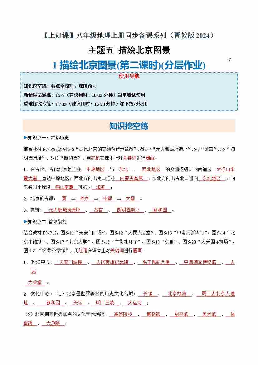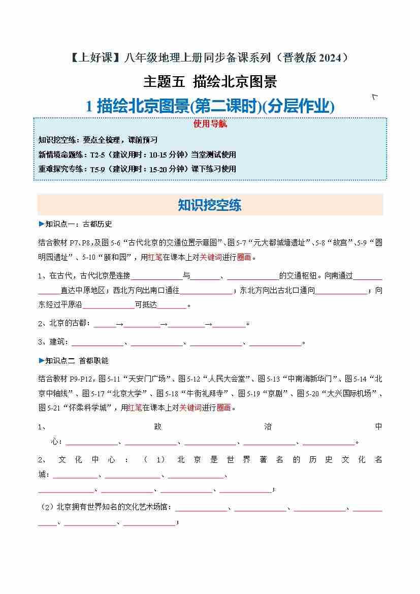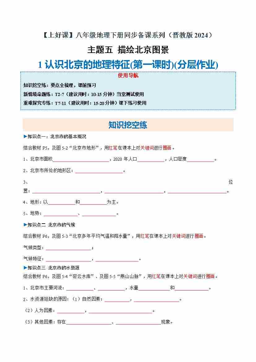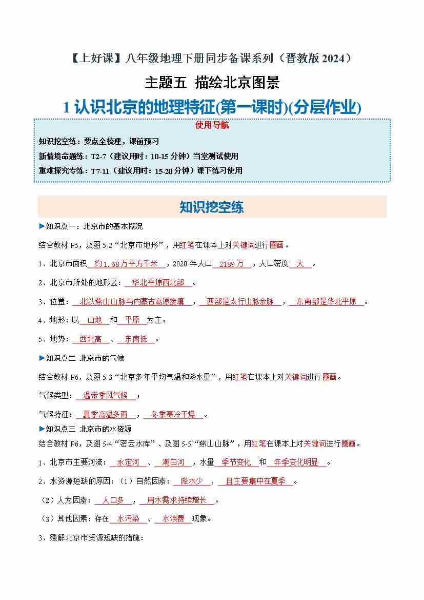 5.1 认识北京的地理特征 第2课时(分层作业)(原卷版)