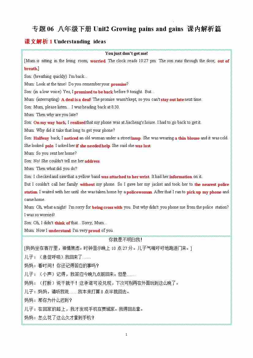 专题06 八年级下册Unit2 Growing pains and gains 课内解析篇 (原卷版)