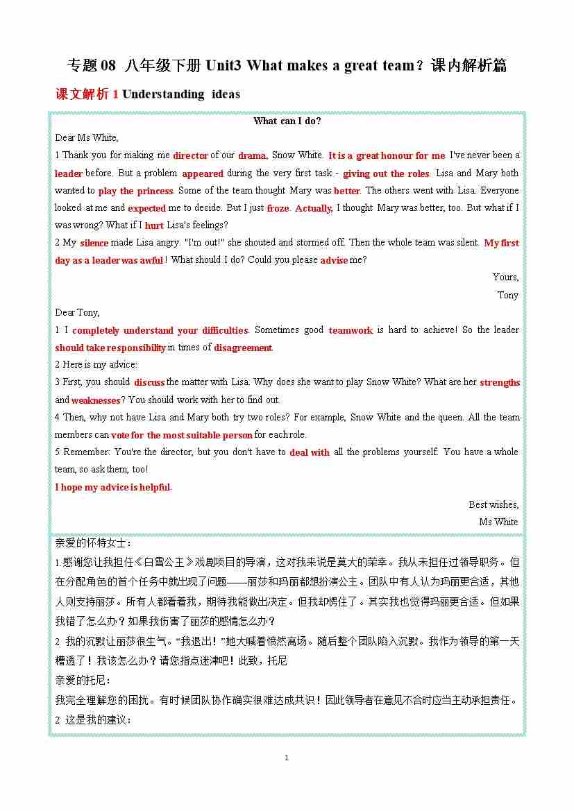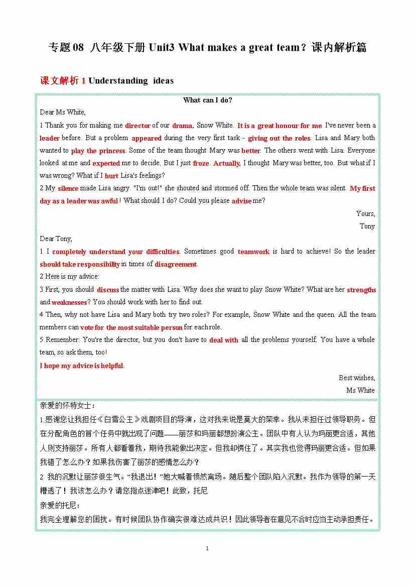 专题08 八年级下册Unit3 What makes a great team?课内解析篇 (解析版)