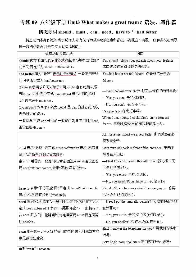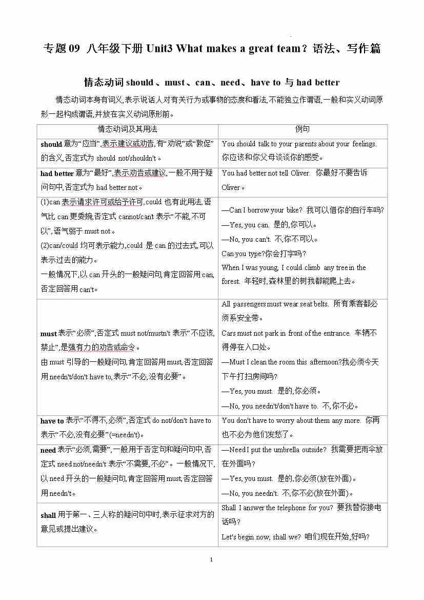 专题09 八年级下册Unit3 What makes a great team?语法、写作篇(原卷版)