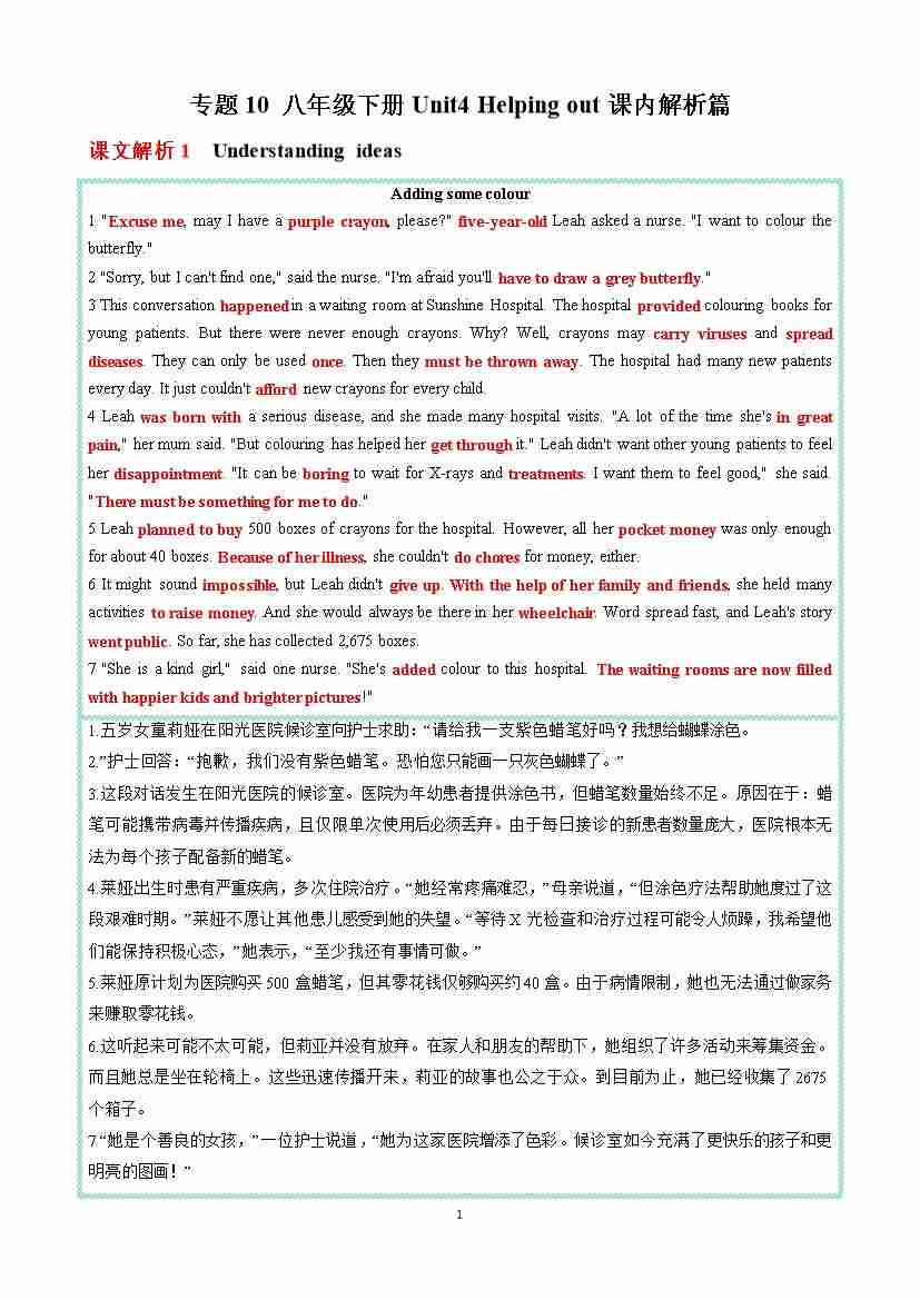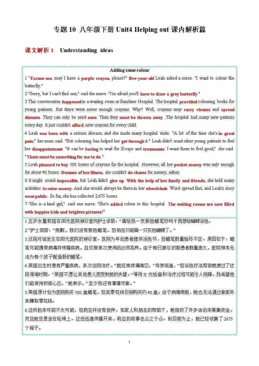专题10 八年级下册Unit4 Helping out课内解析篇 (解析版)
