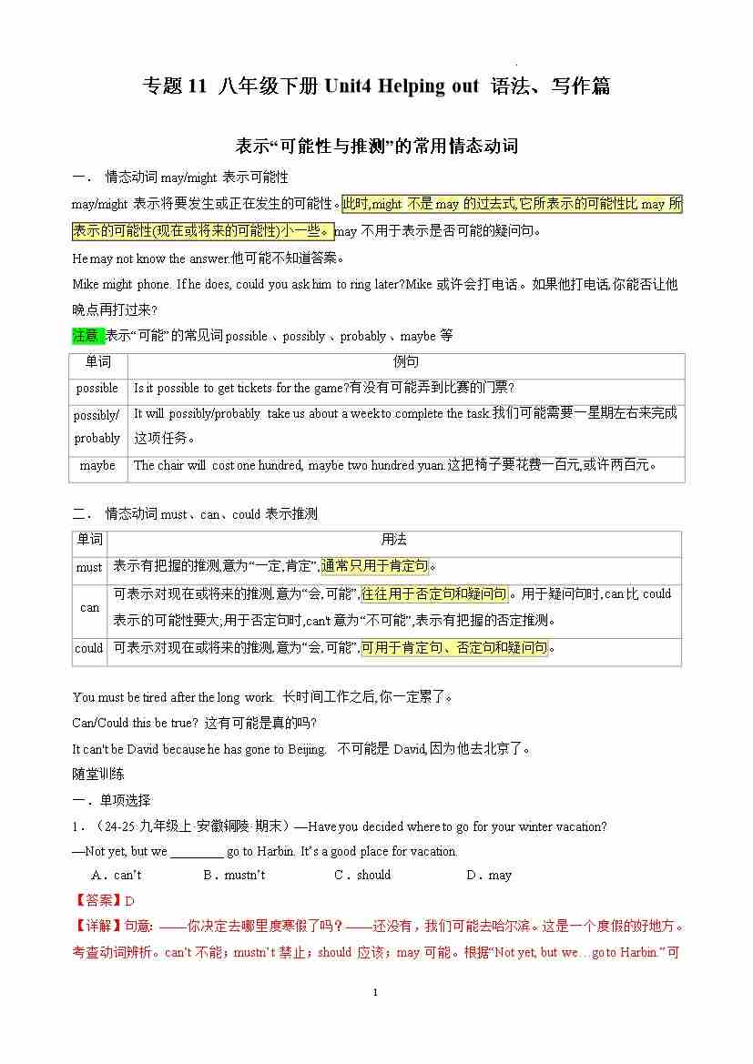 专题11 八年级下册Unit4 Helping out 语法、写作篇 (解析版)
