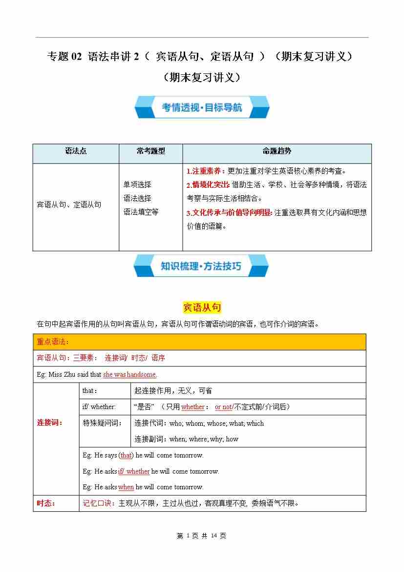 专题02 语法串讲2( 宾语从句、定语从句 )(期末复习讲义)(解析版)