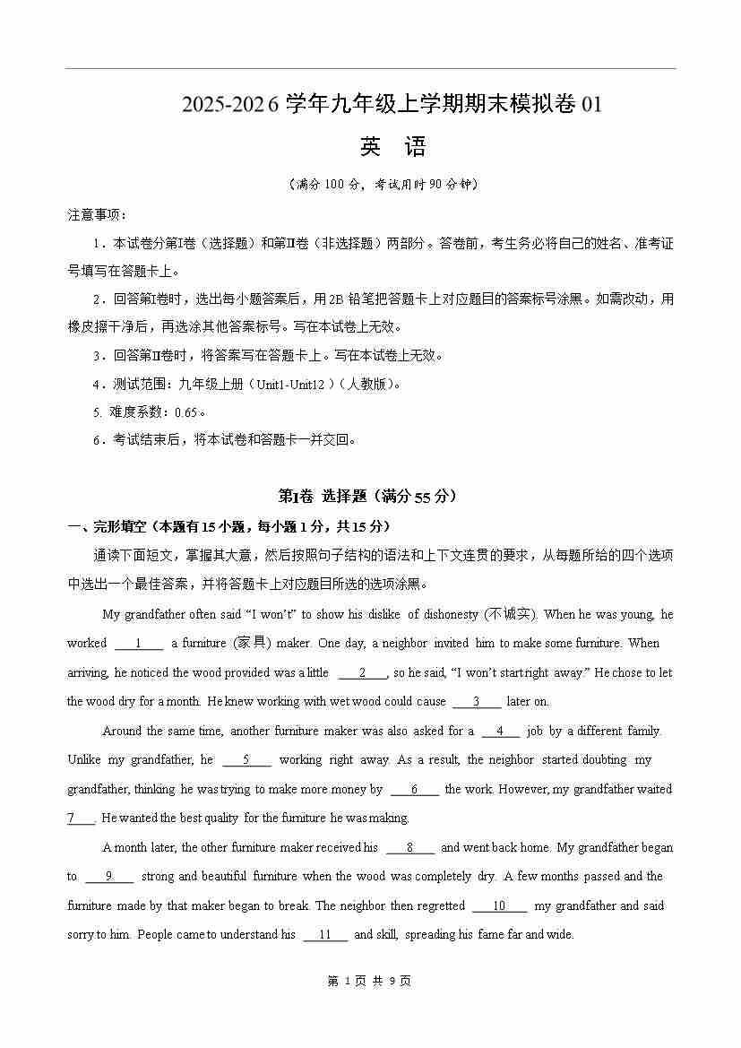 九年级英语上学期期末模拟卷01(人教版)(解析版)