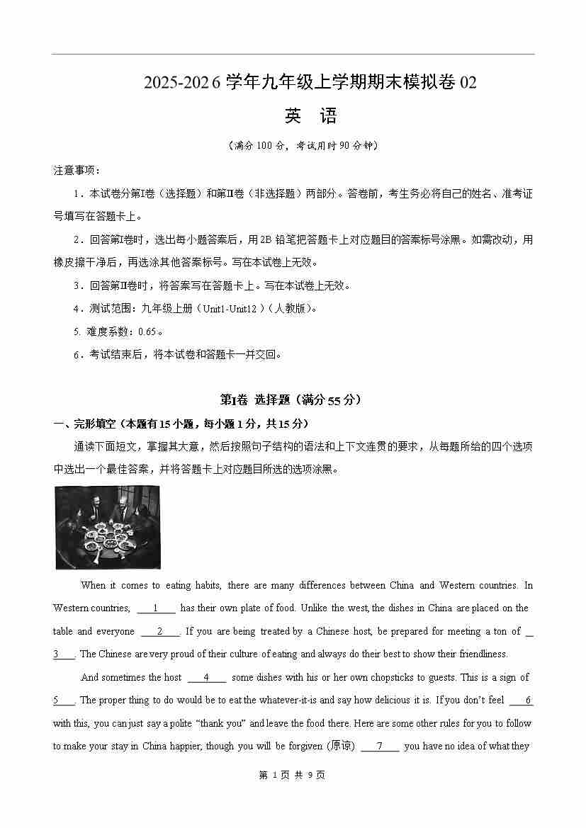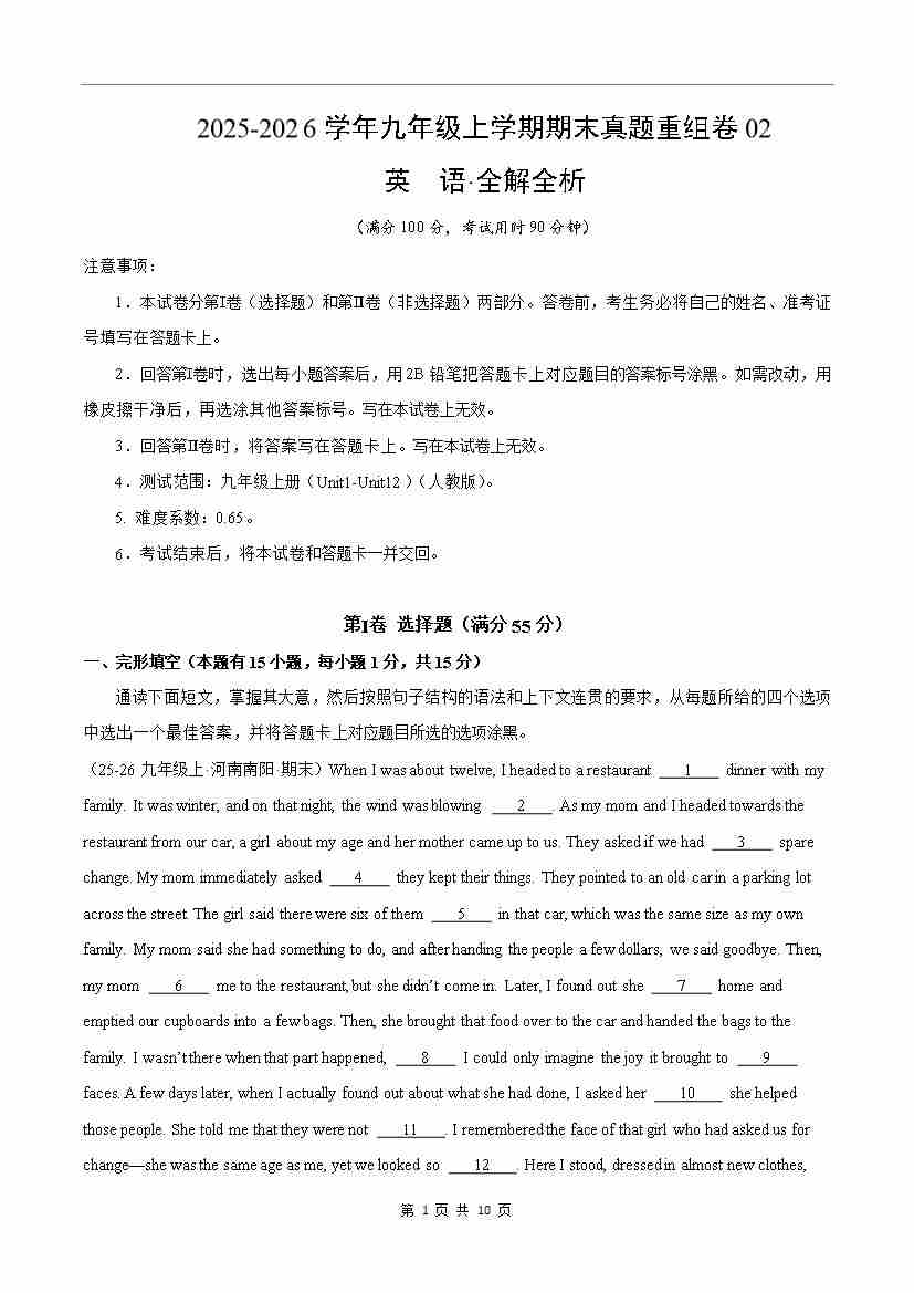 九年级英语上学期期末真题重组卷02(人教版)(考试版A4)