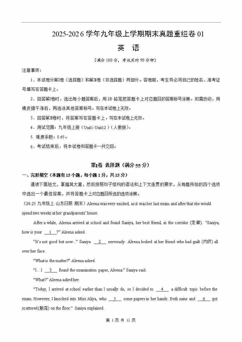 九年级英语上学期期末真题重组卷01(人教版)(考试版A4)