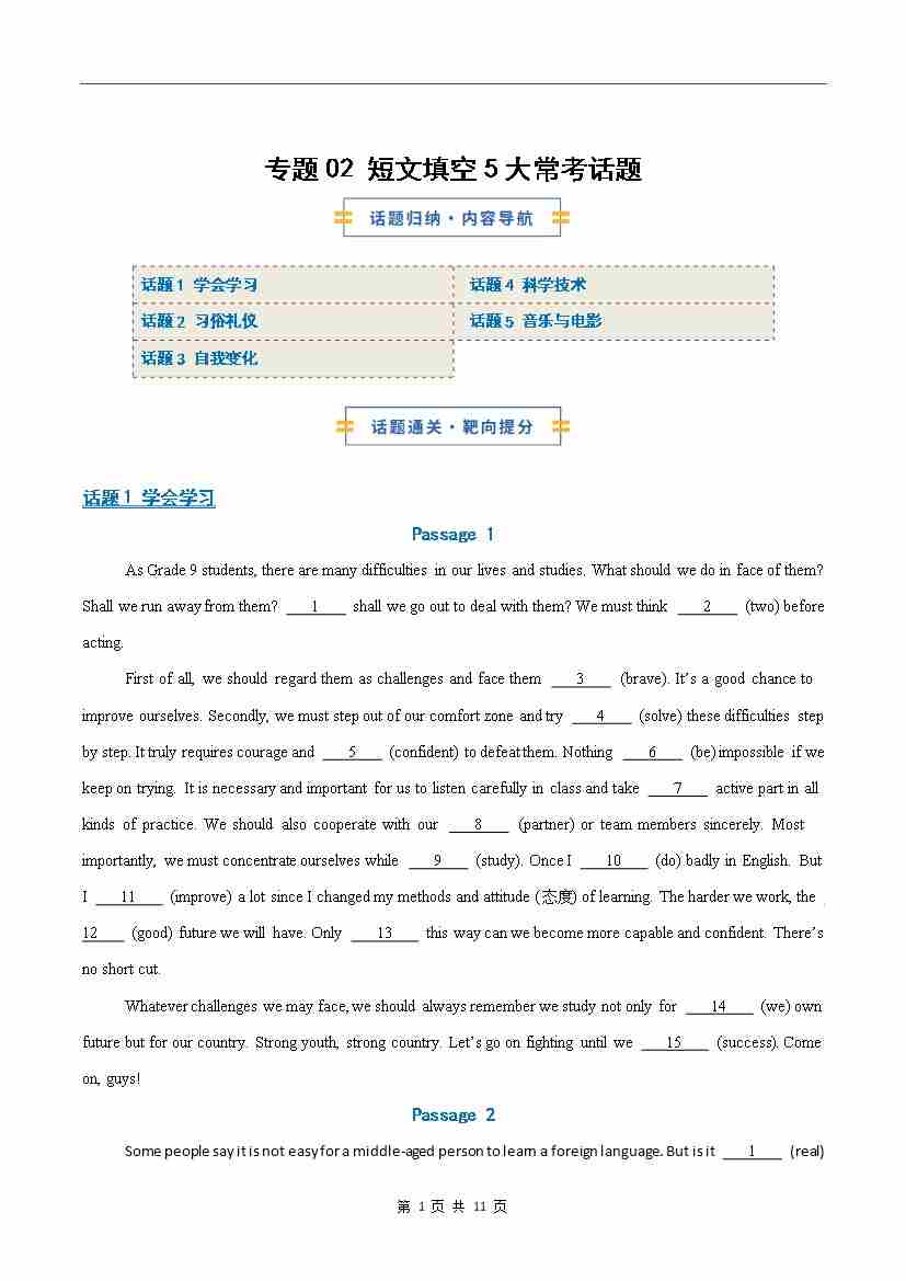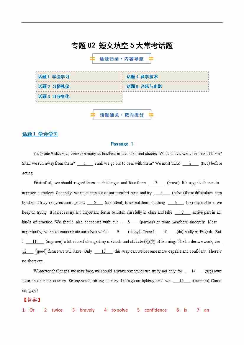 考前押题02 短文填空5大常考话题(期末复习专项训练)(解析版)