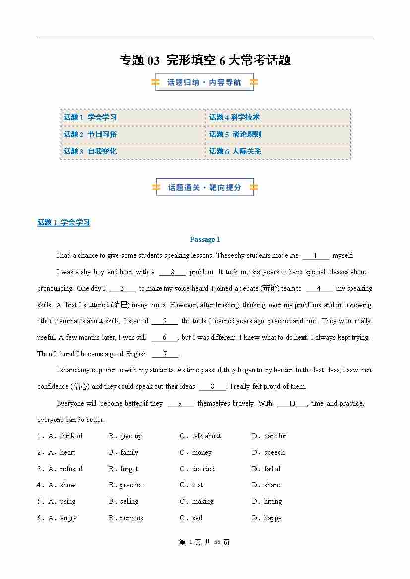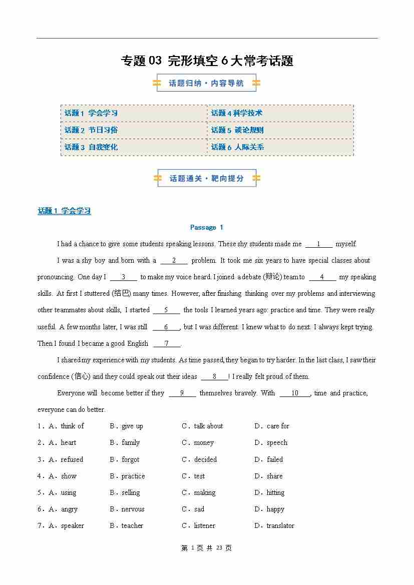 考前押题03 完形填空6大常考话题(期末复习专项训练)(解析版)