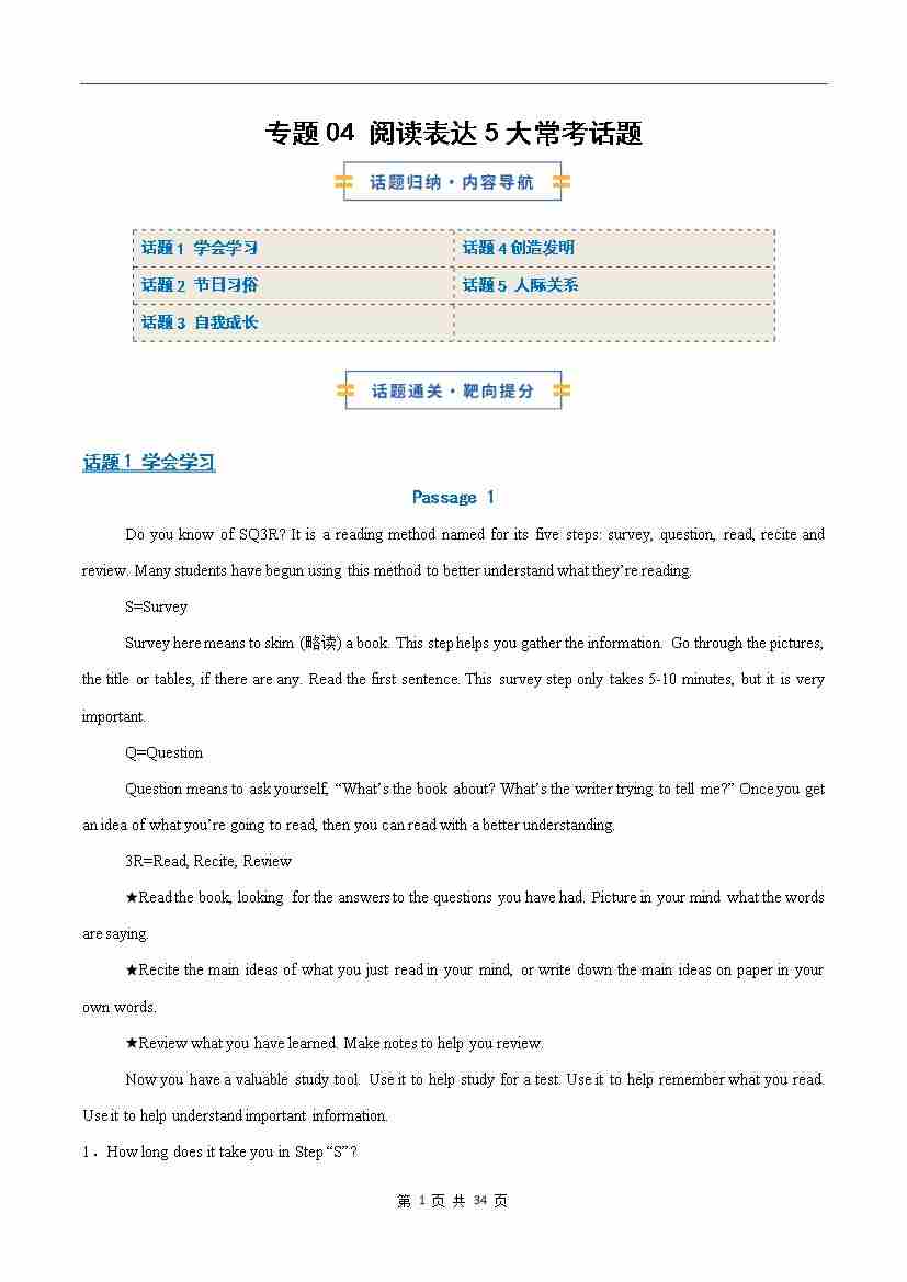 考前押题04 阅读表达5大常考话题(期末复习专项训练)(原卷版)