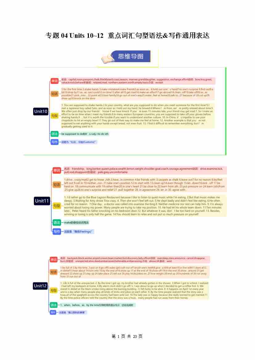 专题04 Units10~12 重点词汇句型语法&写作通用表达(期末复习知识清单)(背诵版)