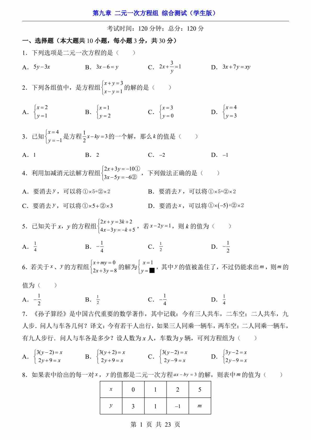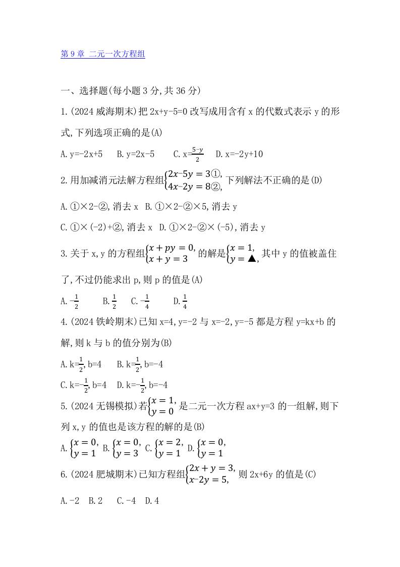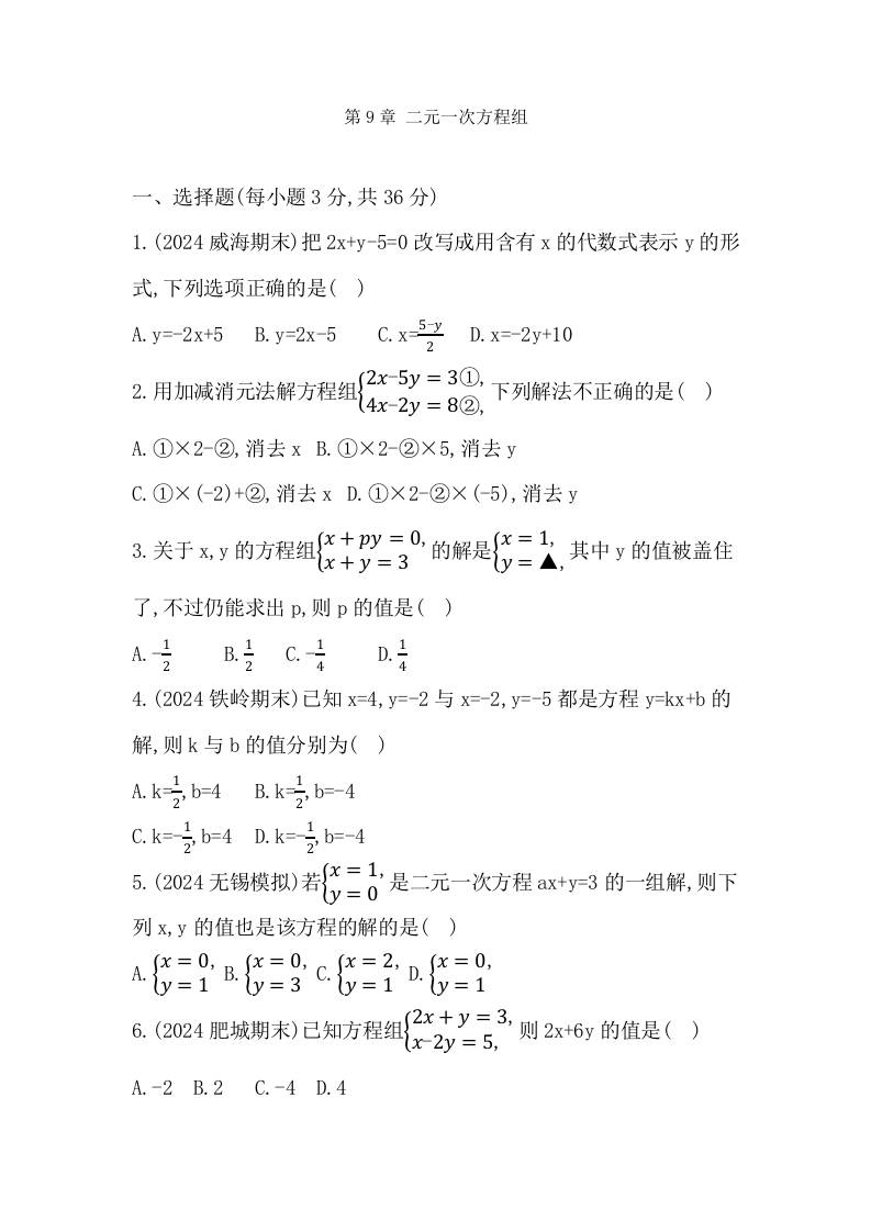 第9章 二元一次方程组(综合测试)