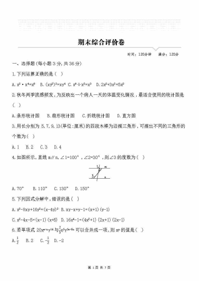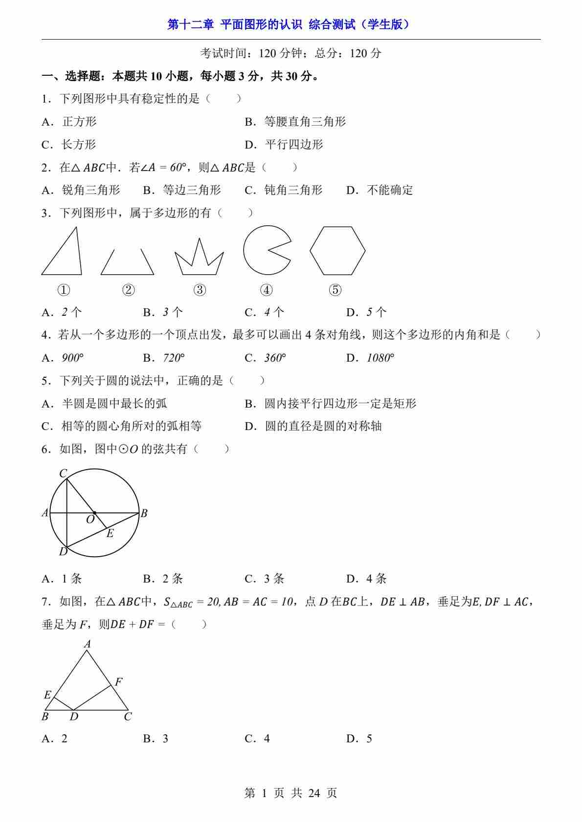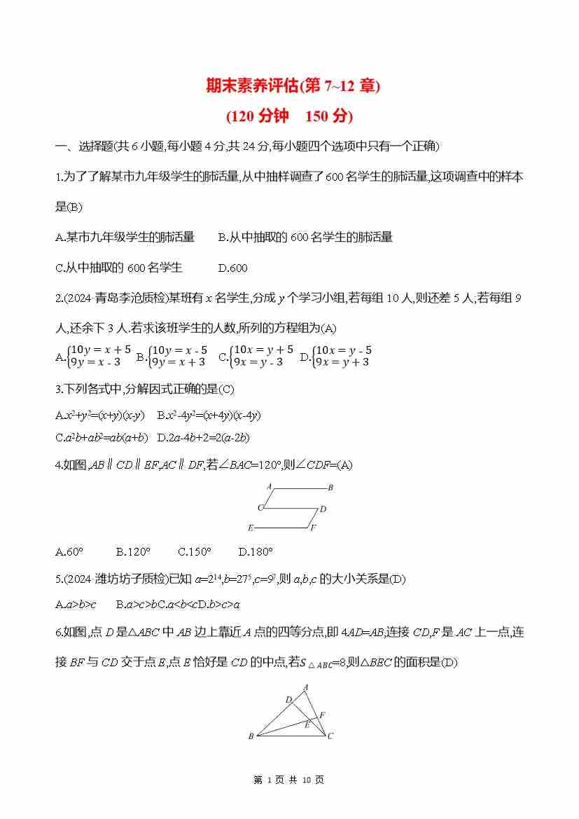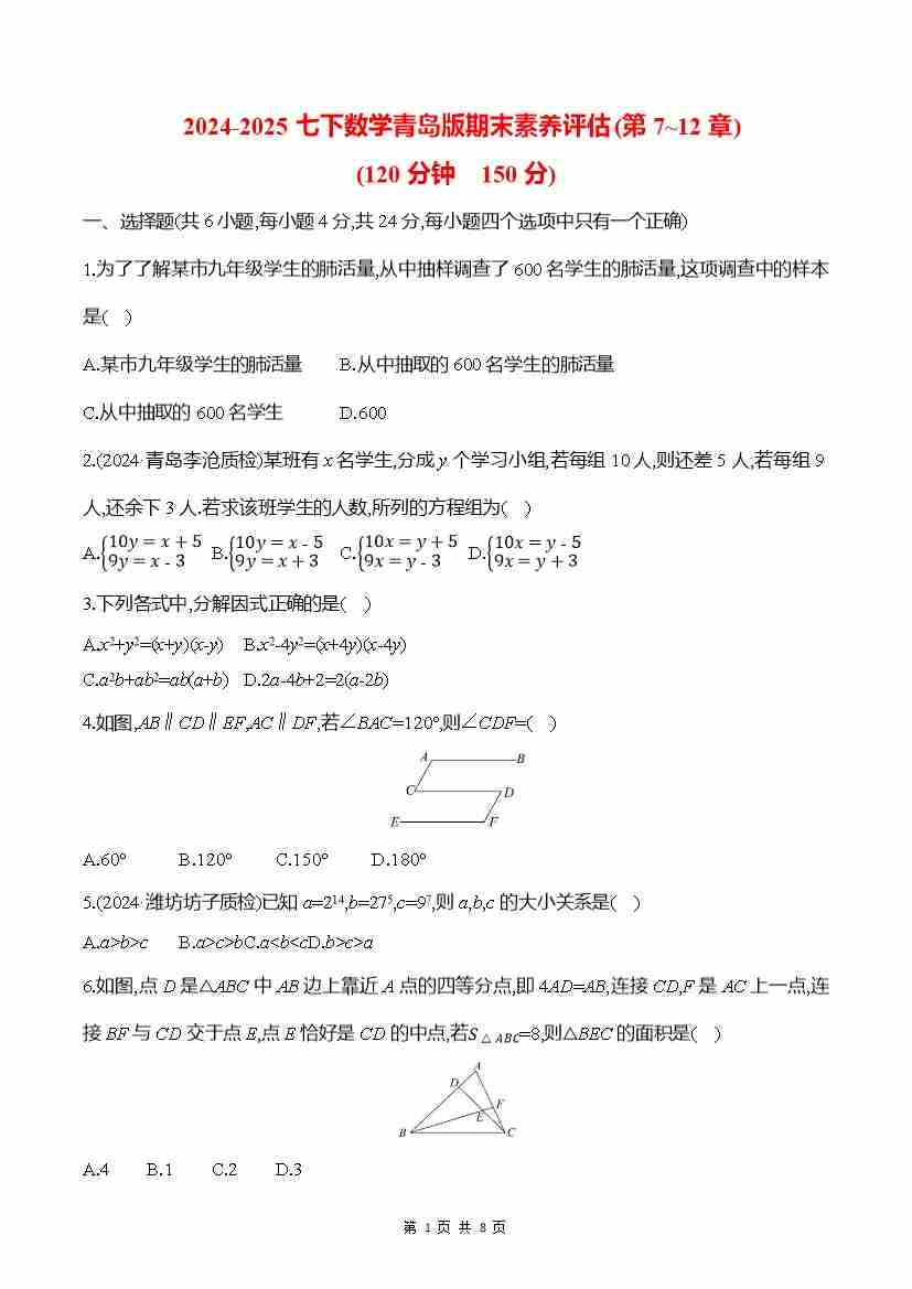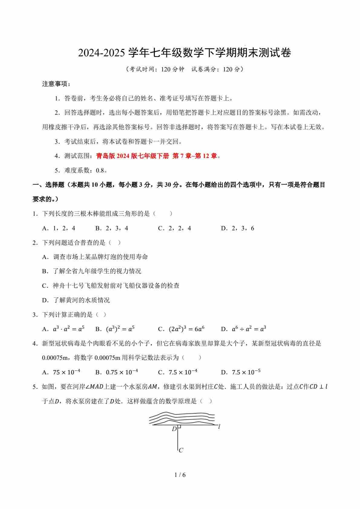 2024-2025学年七年级数学下学期期末测试卷(原卷版)【测试范围:七年级下册第7章-第12章】(青岛版)