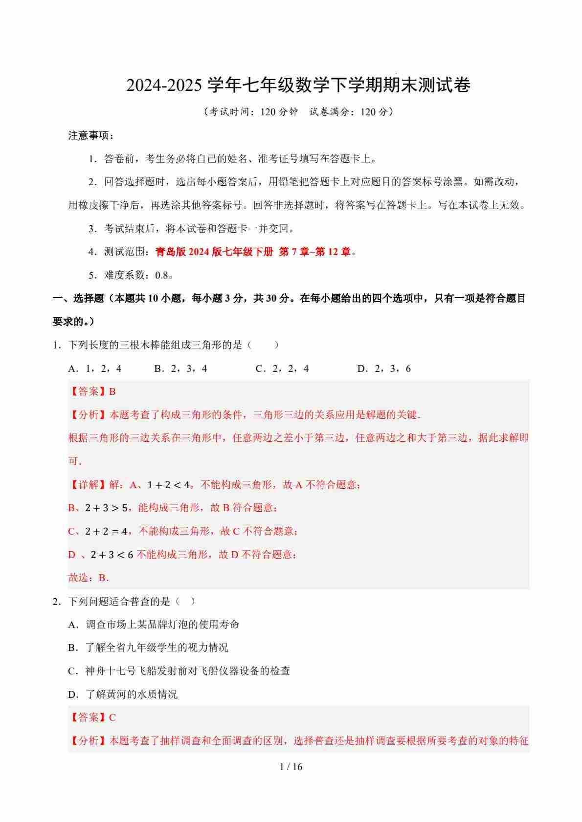 2024-2025学年七年级数学下学期期末测试卷(解析版)【测试范围:七年级下册第7章-第12章】(青岛版)