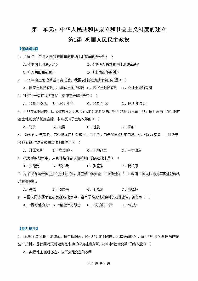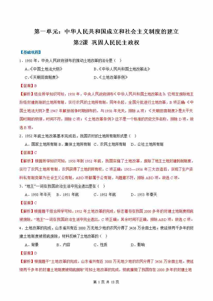 第2课 巩固人民民主政权(任务型分层作业)(解析版)