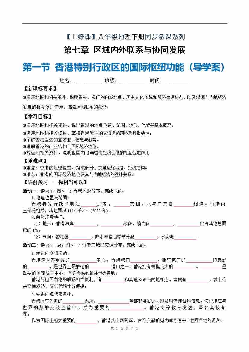 7.1 香港特别行政区的国际枢纽功能(导学案)(原卷版)
